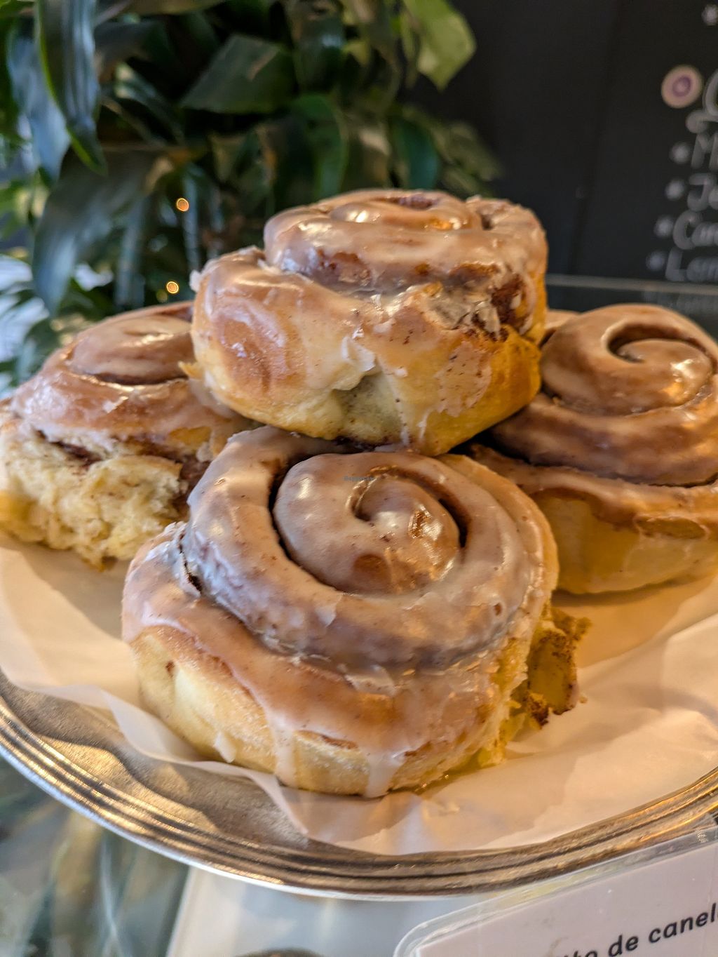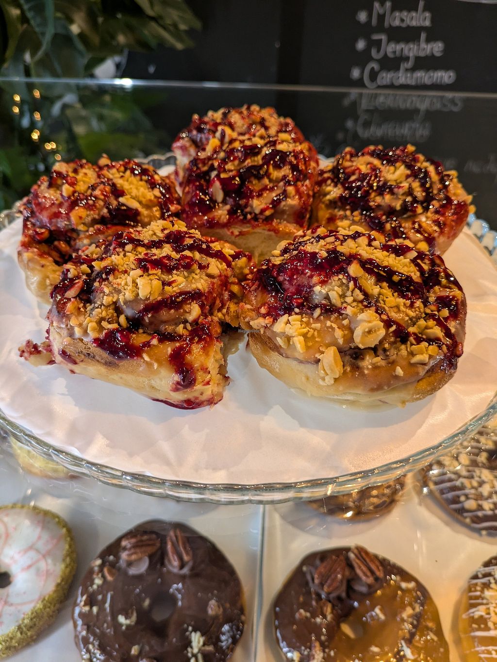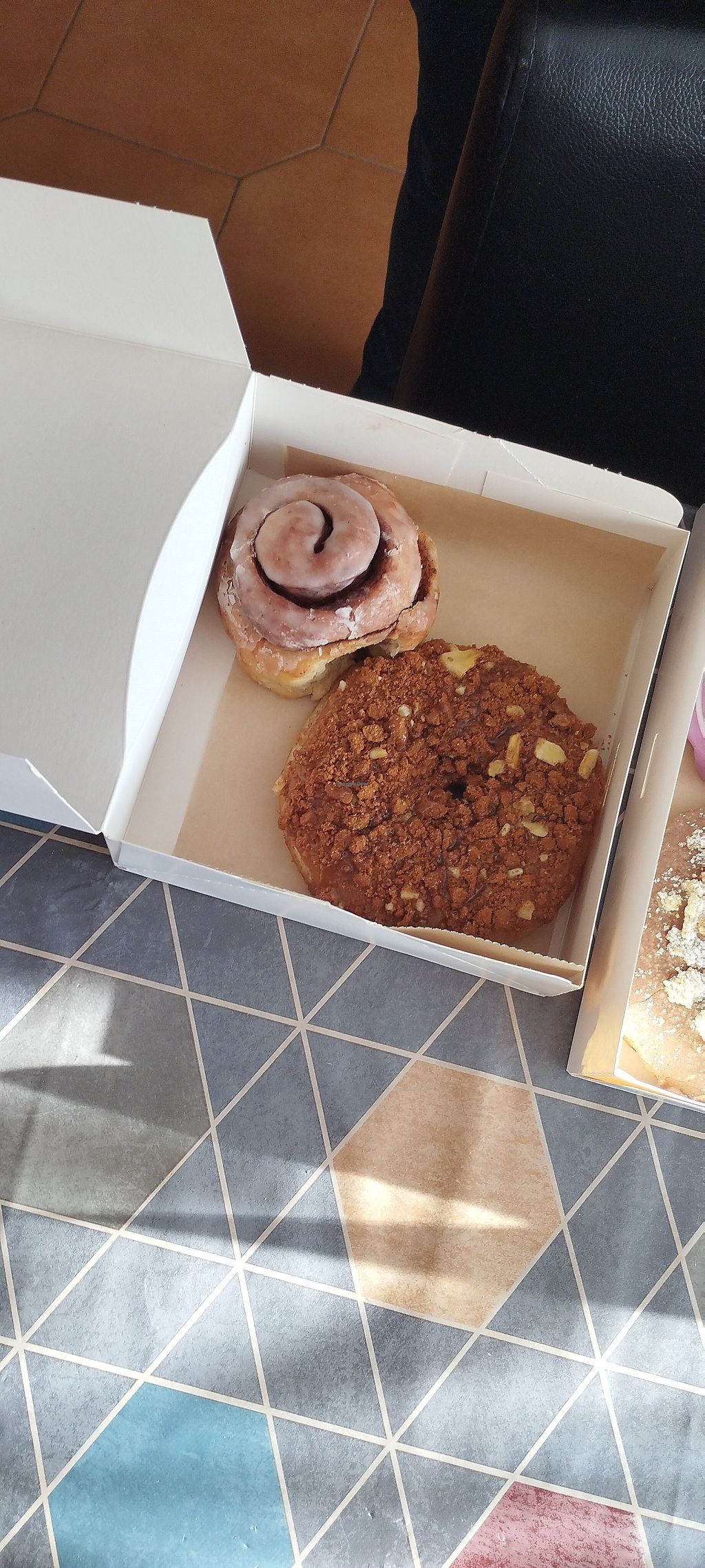 Fuimos a probar con unos "agujeros de donut" y nos encantaron los sabores asi que pedimos que nos preparasen una caja con donuts y un rollito de canela para llevarnos.