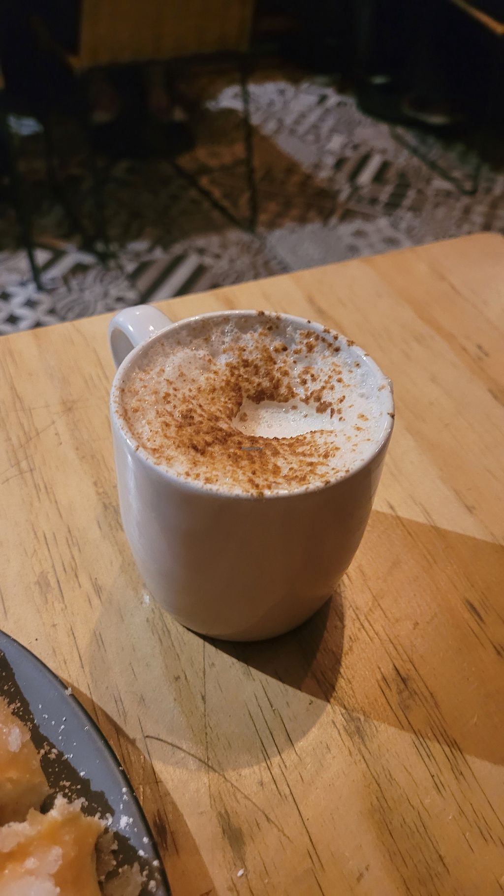 Off the main street, pretty quiet atmosphere, excellent food at a really good price. Big portion sizes, with a small store to get a variety of dairy free milks (oat, almond, soya)