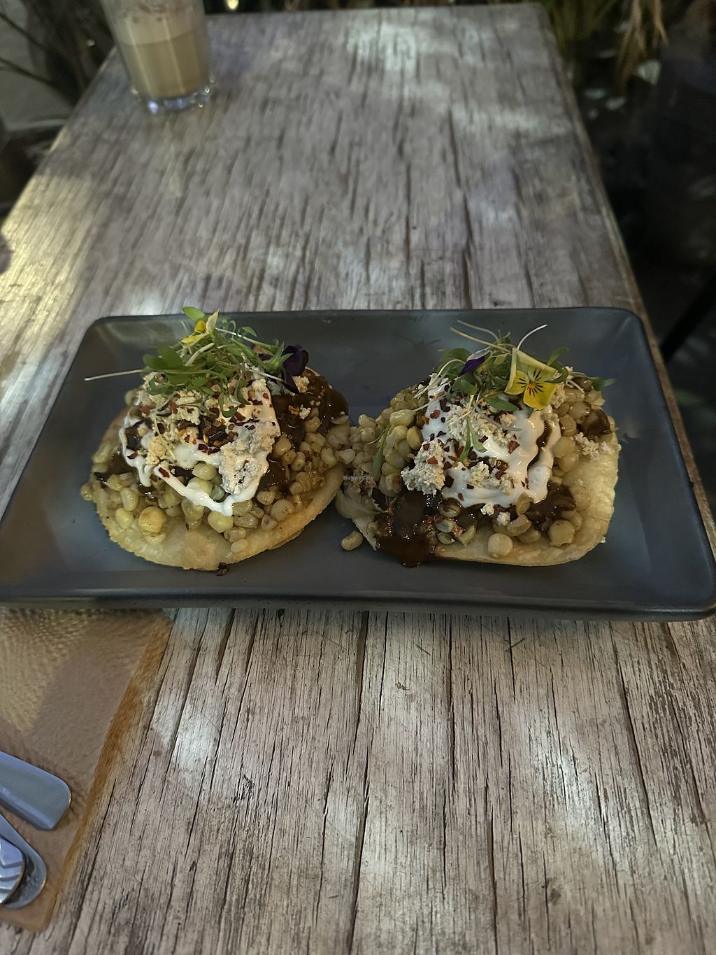 Location is excellent, food is (just) good. Their more attractive item is the freshness of their ingredients, that they work with eatable and delicious flowers and their kindness and customer service. As for the menu, I think it’s pretentious and a bit on the expensive side. As an example the chickpea chorizo is just chickpeas with a sauce😡not very creative haha but nevertheless the flavor is good and they accommodate if you don’t like something they offer you a change to your liking (for me is green/yellow/red pepper). In the end it was a good experience… it was my 3rd time eating here 😅