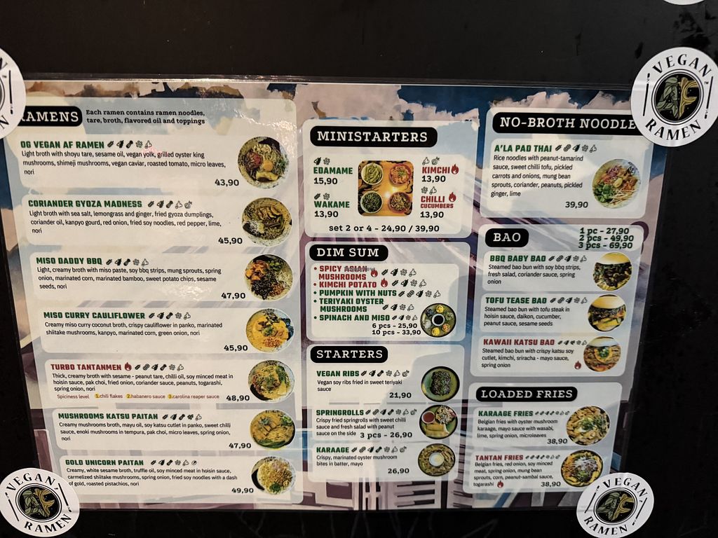 Vegan ramen shop. Offers four variations of ramen as well as ribs, dim sum, salads and ice cream. Serves hand made vegan eggs for ramen. Open Mon-Thu 12:00-21:00, Fri-Sat 12:00-22:00, Sun 12:00-20:00.