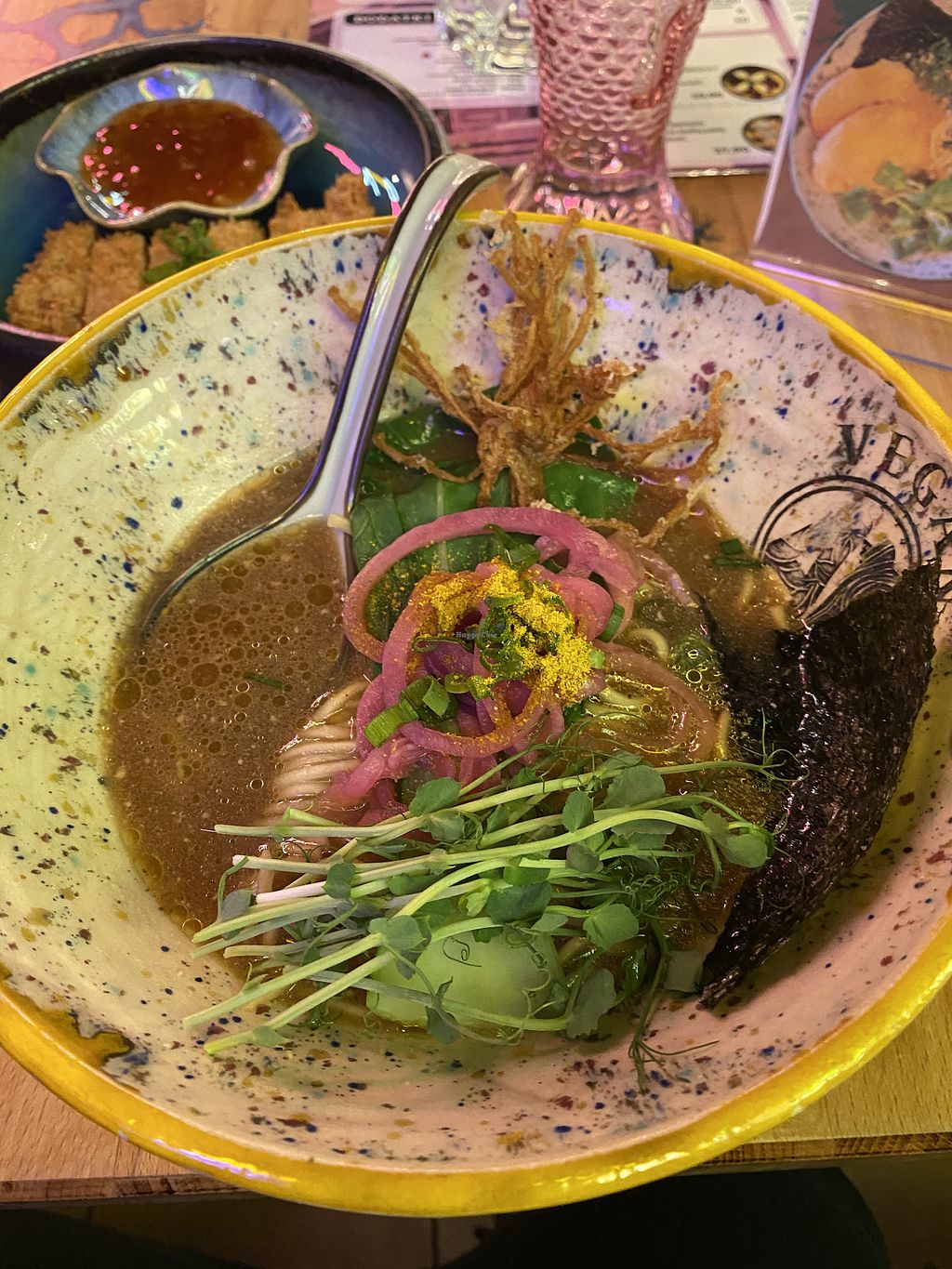 Although vegan, not really a vegan friendly place as their ramens simply don't have much calories. You end up spending a lot when hungry as there are no lower priced starters. I'd say it's more of a lifestyle place than a place to satisfy your hunger.