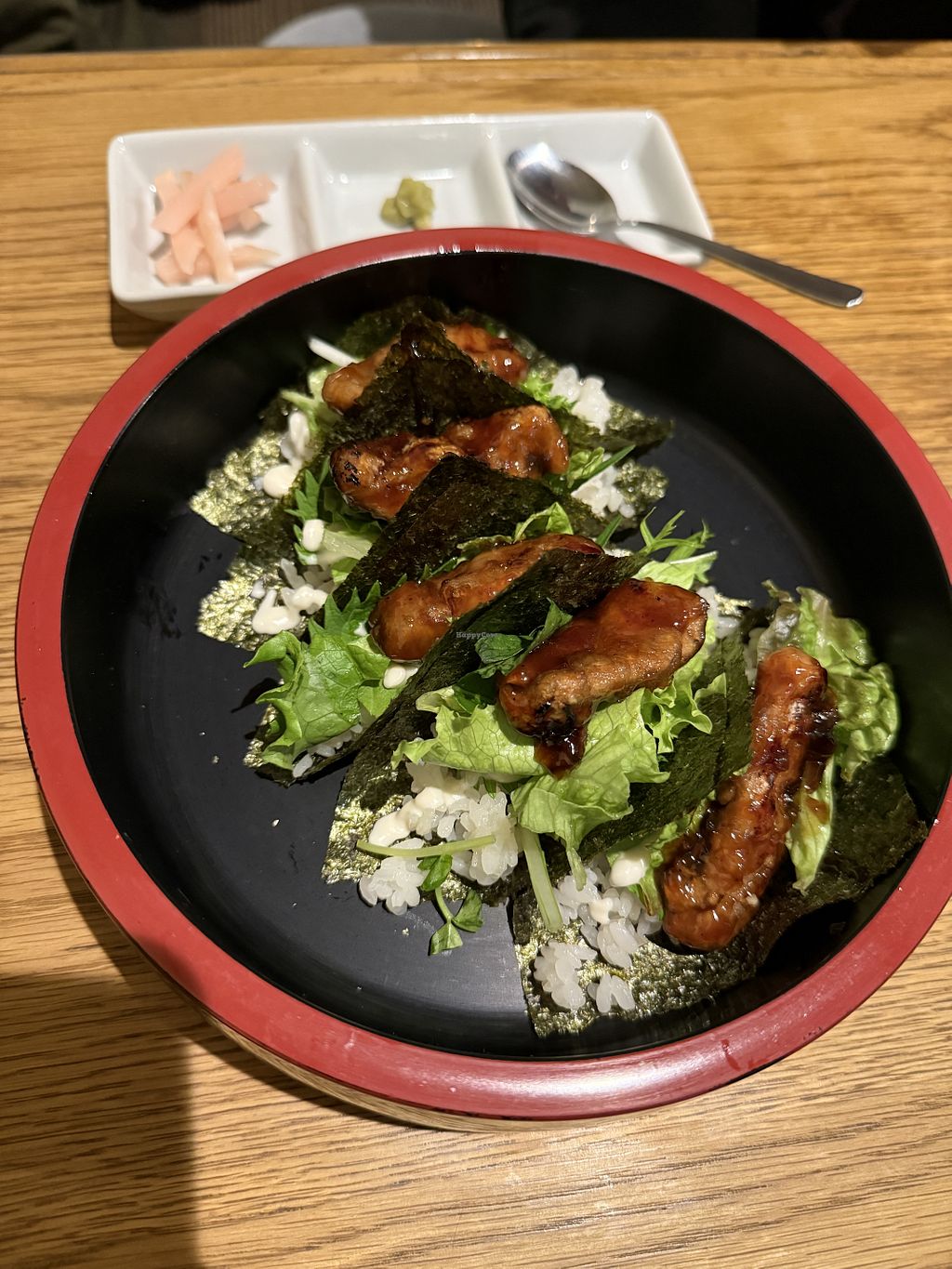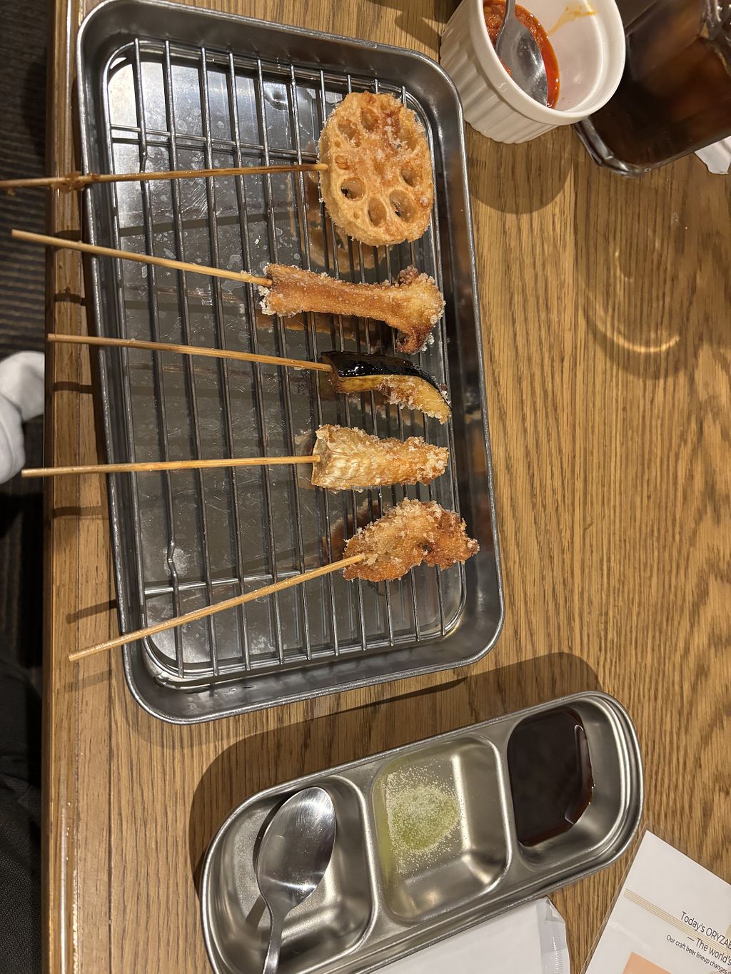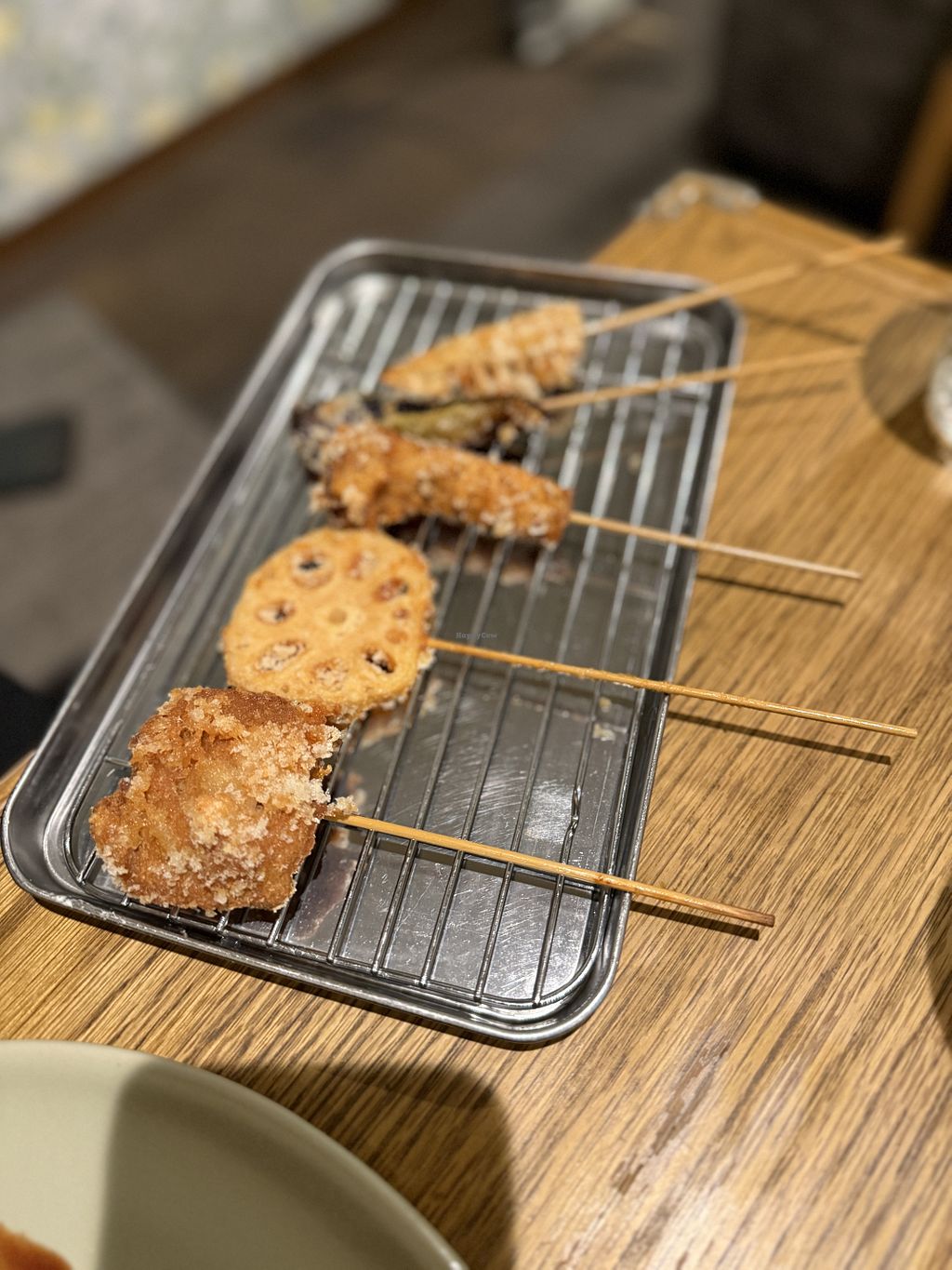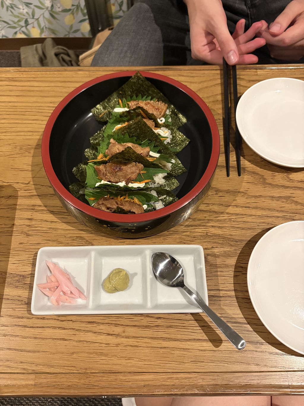 We got sat in a cozy long room. Server was friendly and spoke very good English. Ordered the hand roll sushi, okonomiyaki, gyoza, and kushikatsu skewers. Everything was good but the okonomiyaki was definitely a standout, and the gyoza were just okay. We also had parfait for dessert which was good. Not one of my fav dinners in Japan but def recommend if you’re close by!