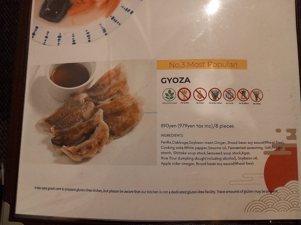 Vegan restaurant offering traditional Osaka dishes such as okonomiyaki, takoyaki, kushikatsu, as well as traditional Japanese dishes that include temaki sushi, karaage and more. Also known as Vegan and GlutenFree Osaka. Also offers some alliums free items. Address in Japanese: 大阪駅前第四ビル. Open Mon-Tue 11:00am-10:00pm, Thu-Sun 11:00am-10:00pm. Closed Wed. Hours are subject to change - check ahead.