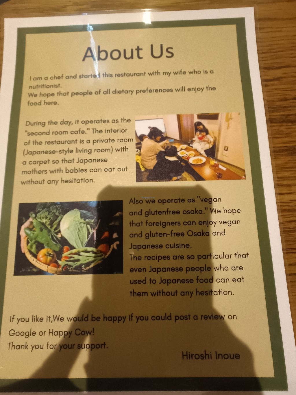 Pros: Vegan Osaka cuisine , Very friendly service , Quiet semi-private dining areas