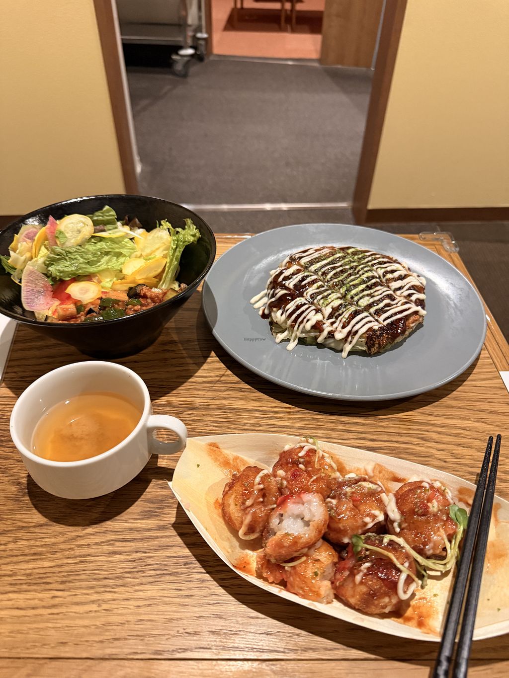 I LOVED this place!! I was hoping to grab some authentic Osaka cuisine (vegan ofc) and this place did NOT disappoint! I left feeling so satisfied (and sad that I can’t make another trip before I leave). I highly recommend visiting if you’re in the area and want to try Osaka style okonomiyaki, takoyaki, and the works. The sitting areas were so cozy and quaint since they’re semi-private. The overall vibes of the restaurant were very pleasant and peaceful (despite being in a mall in a very populated city).