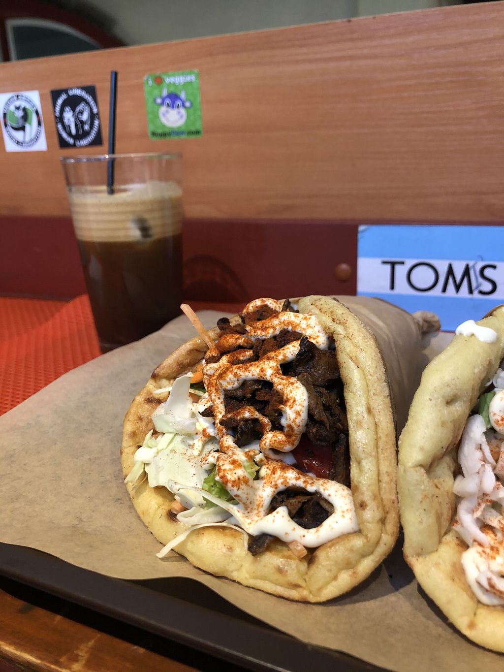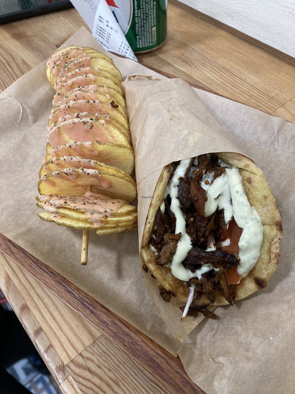 Mushroom gyros with spiral potato from Vegan Beat in Athens. So good! …