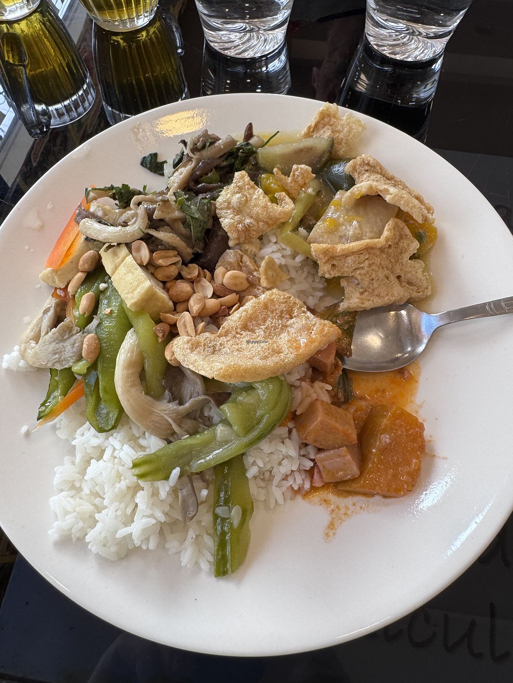 Total for the pork dish, green curry with mock meat and veg, wontons, stir fry and some packaged snacks was 280,000kip