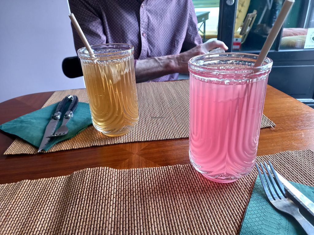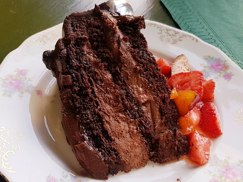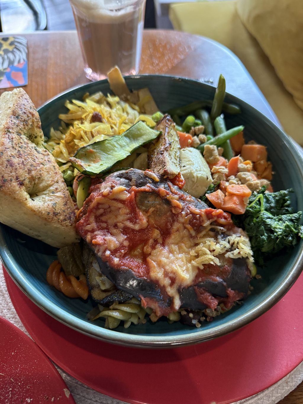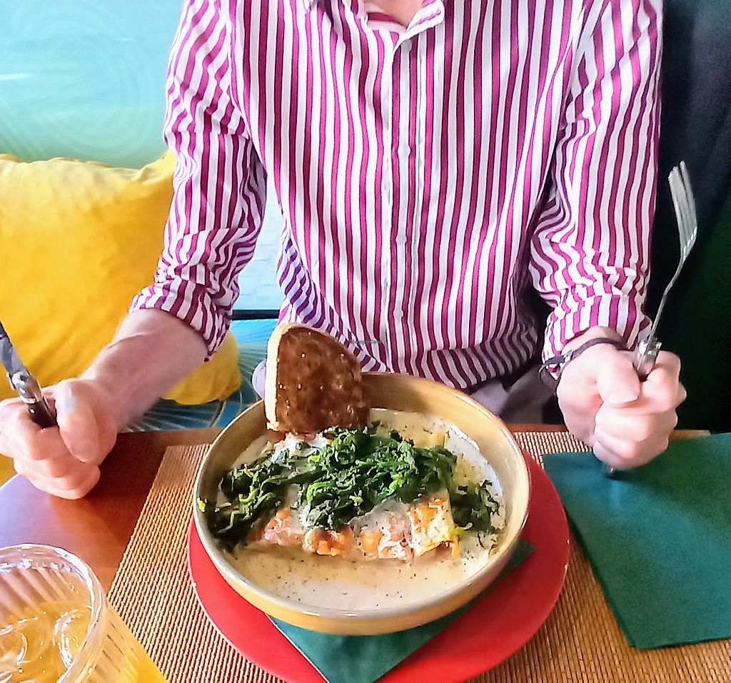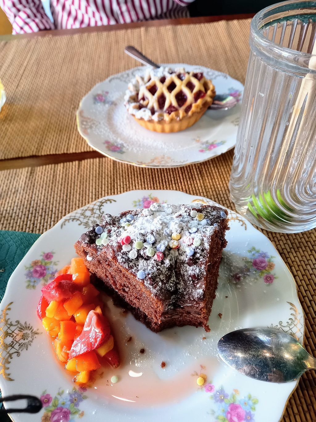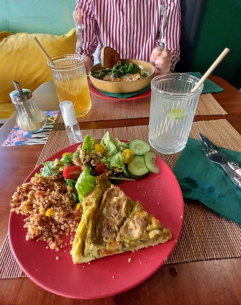 My husband had the cannelloni and a raspberry and ginger iced tea, followed by cherry tart and espresso coffee. I had quiche and salad followed by an amazing chocolate cake garnished with chopped fruit and a decaffeinated Americano with oat milk. Everything freshly made and wonderfully delicious.