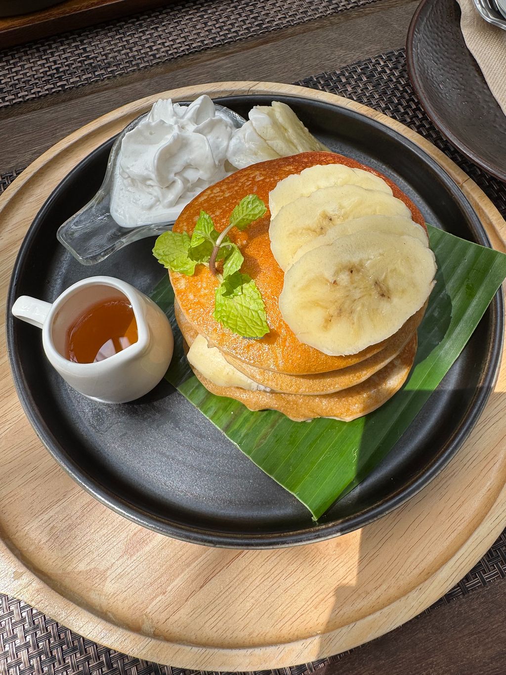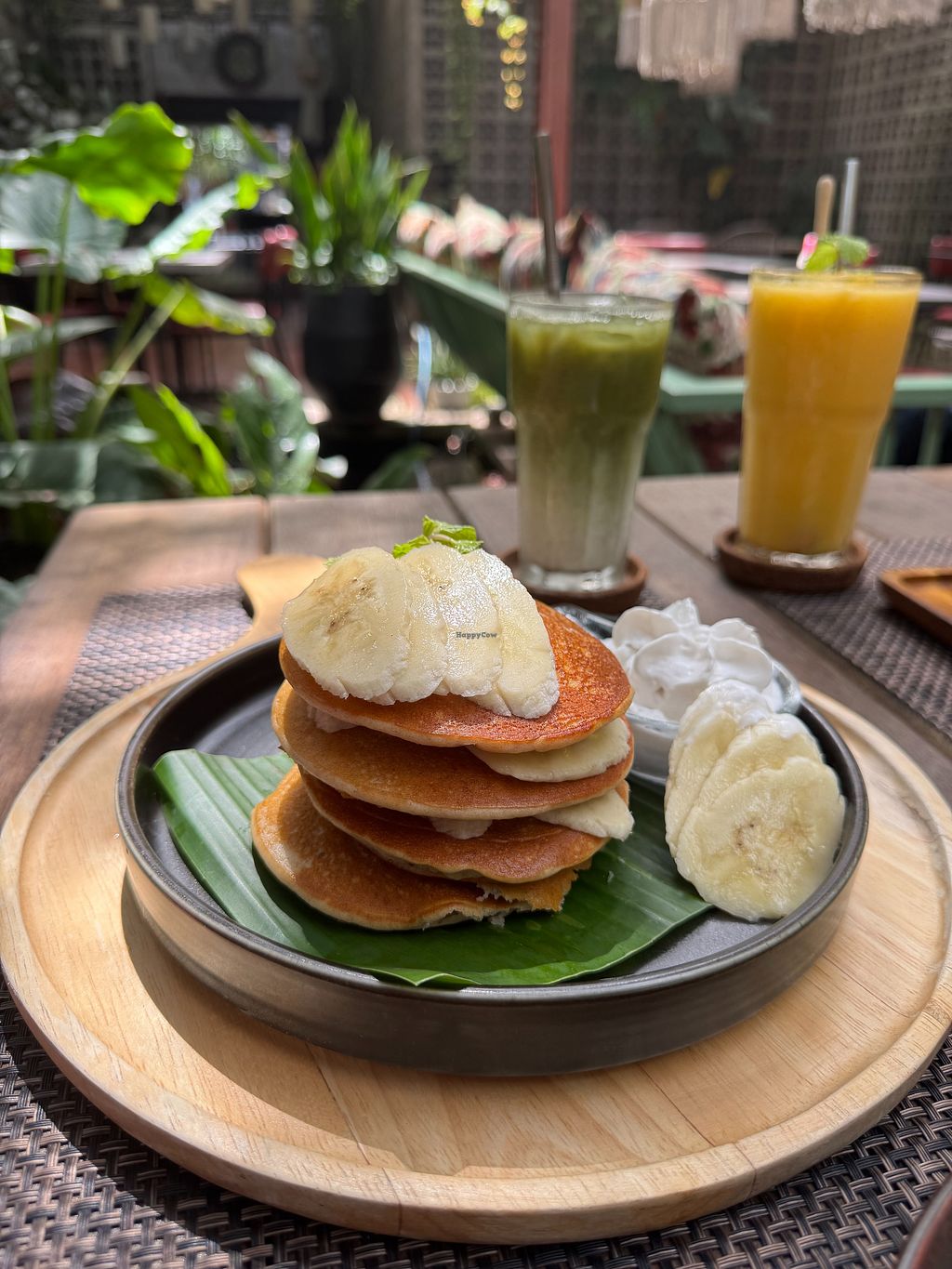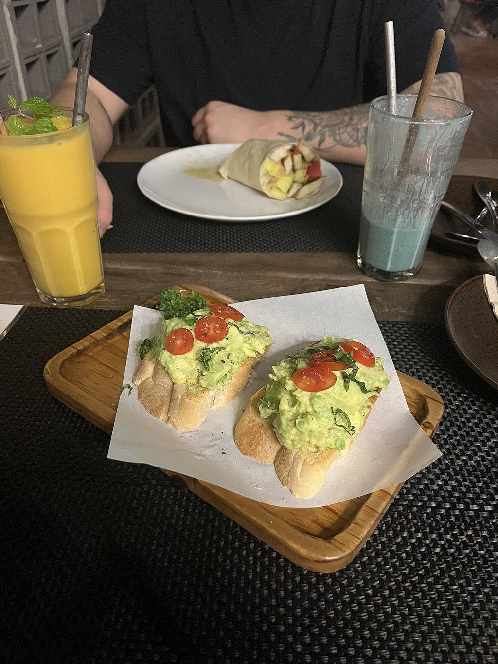 Garlic bread avo, power wrap (1/2 of it left, in the back), mango smoo…