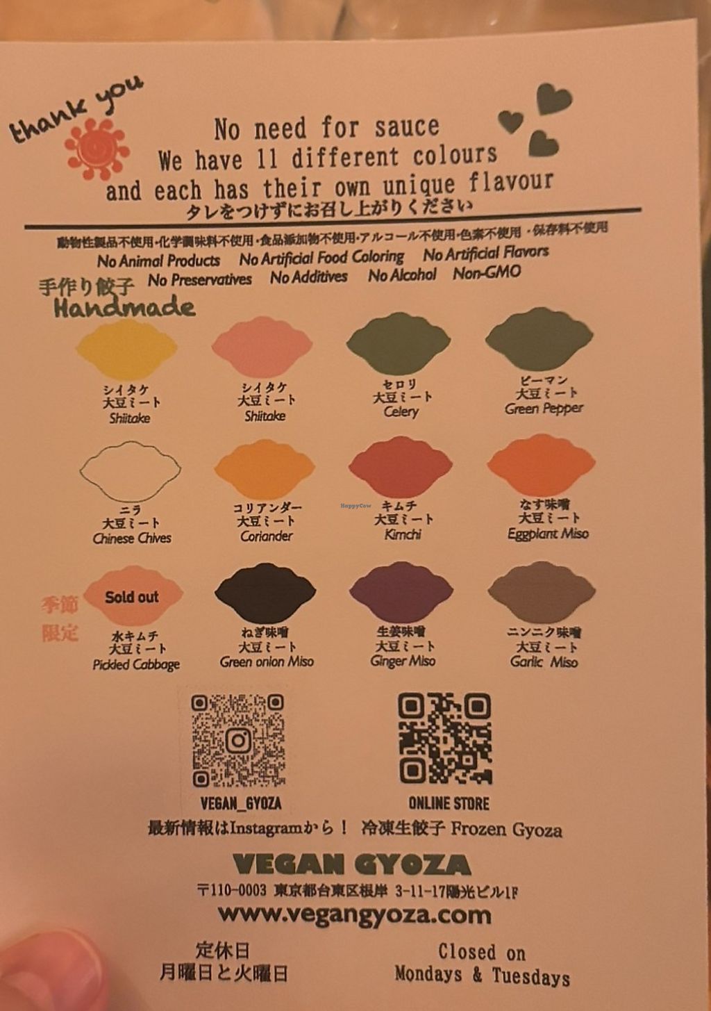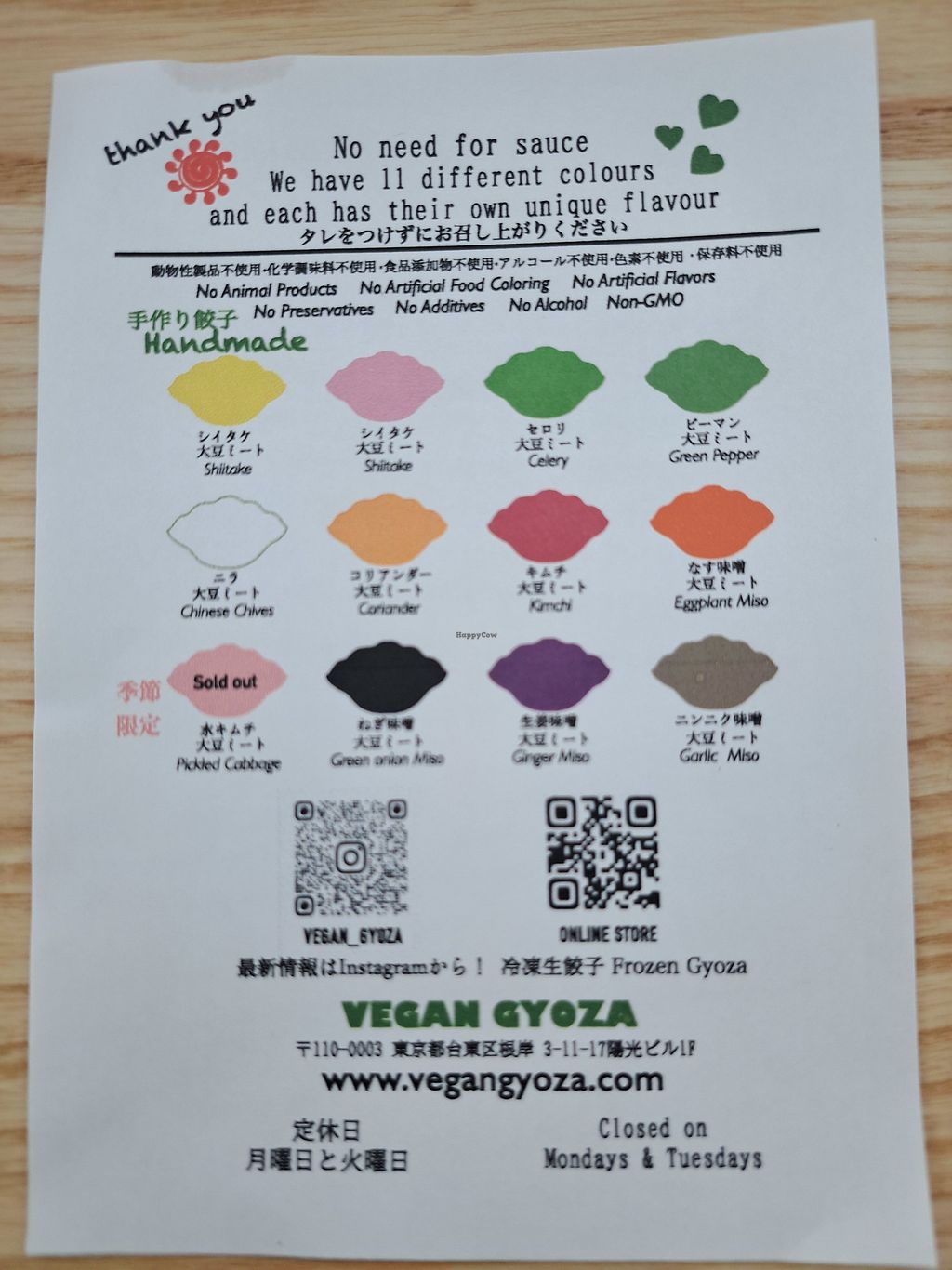 Opened mid-May 2021. Gyoza house and coffee shop. Hours may vary - check IG to confirm. Serves vegan drinks and different gyoza dishes both for sit-in and take-out. Open Wed-Sun 12:00pm-9:00pm. Closed Mon-Tues.