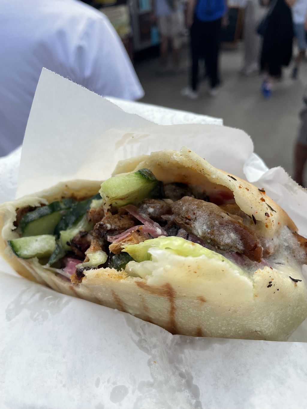 I had to search a bit on the market in Mauer Park, but after 10 minutes I found the vegan gyros spot. They serve one dish, pita with vegan gyros for €8. It tasted really delicious and the portion size was good! If you are in Berlin, visit this place!