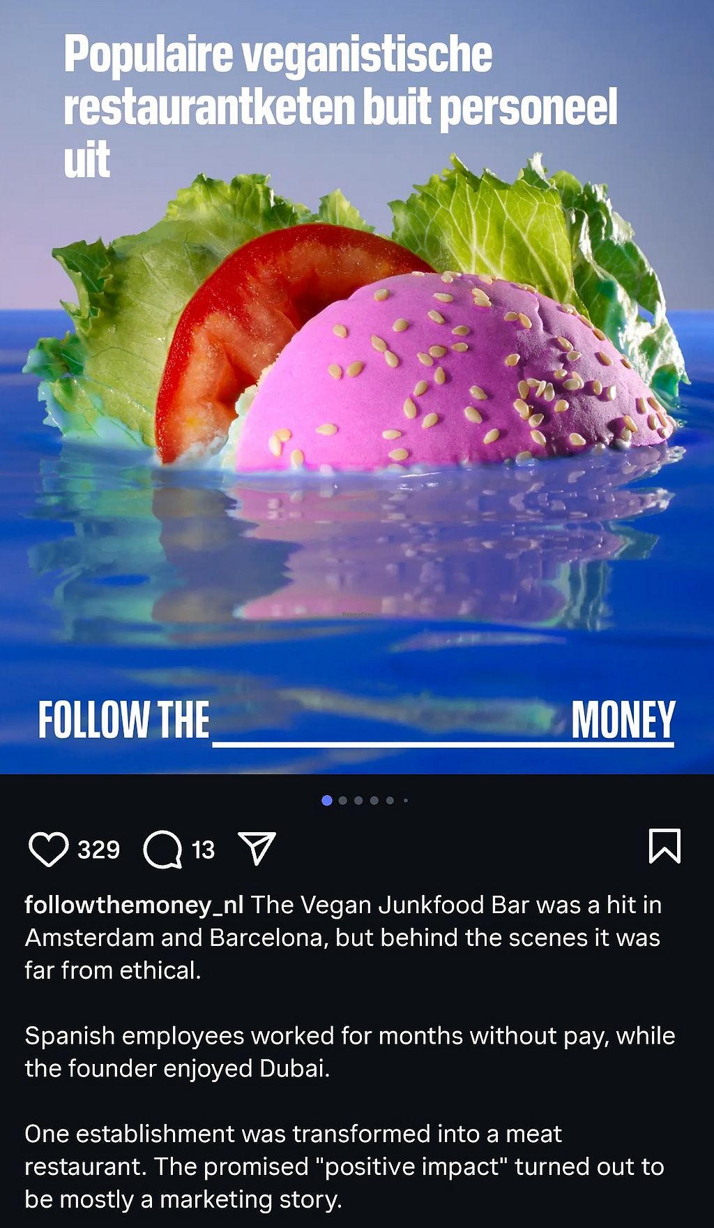 Source: Investigation journalism, interviews with 6 employees https://www.ftm.nl/artikelen/ethiek-is-marketing-bij-vegan-junkfood-bar