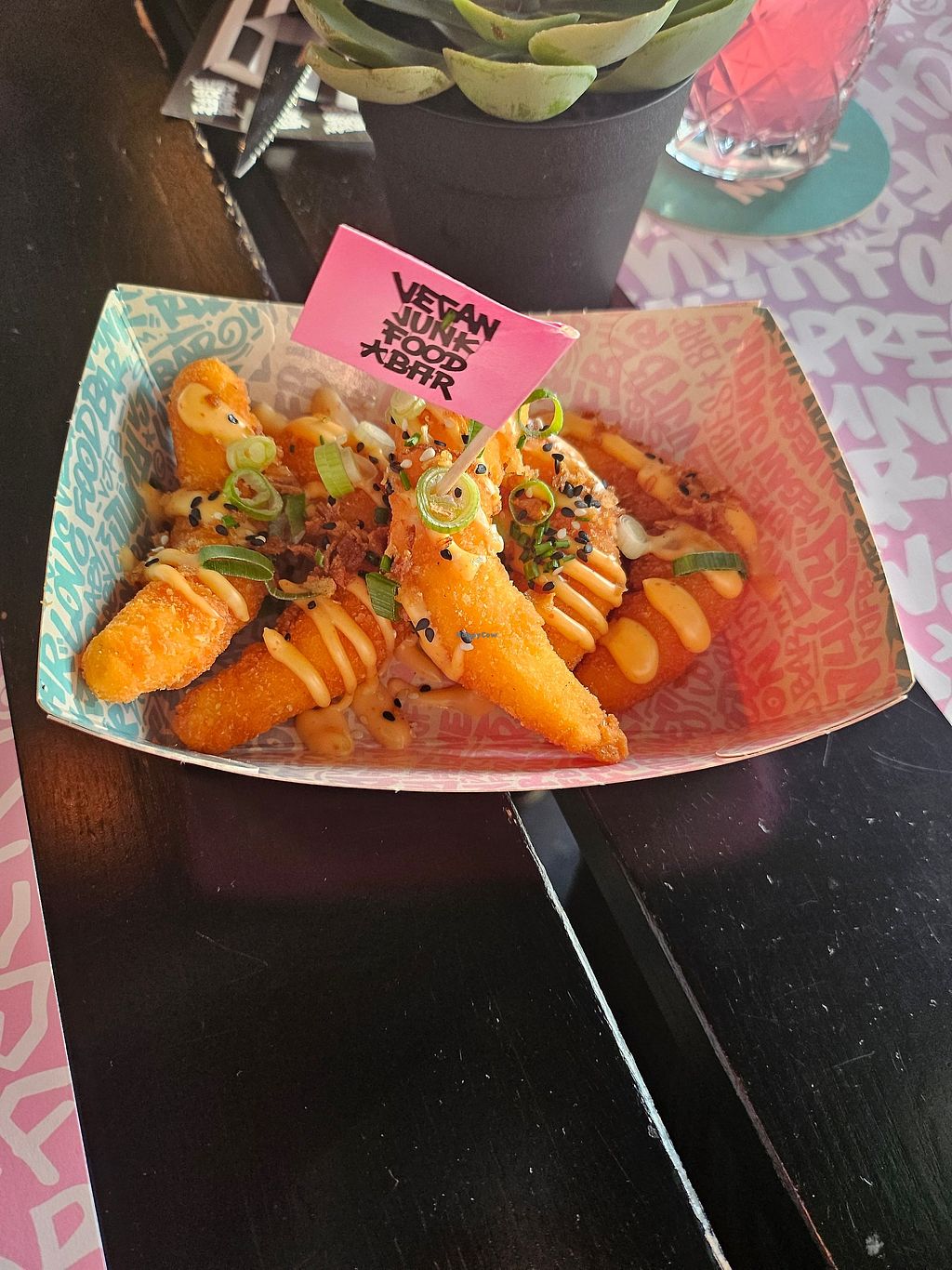 Ich liebe einfach alles an der veganen Junk Food Bar 🩷 , man bekommt hier einiges an Junkfood und das komplett vegan , bunt und einfach so lecker. Ein so schöner Ort , tolles Essen und super freundliche Menschen