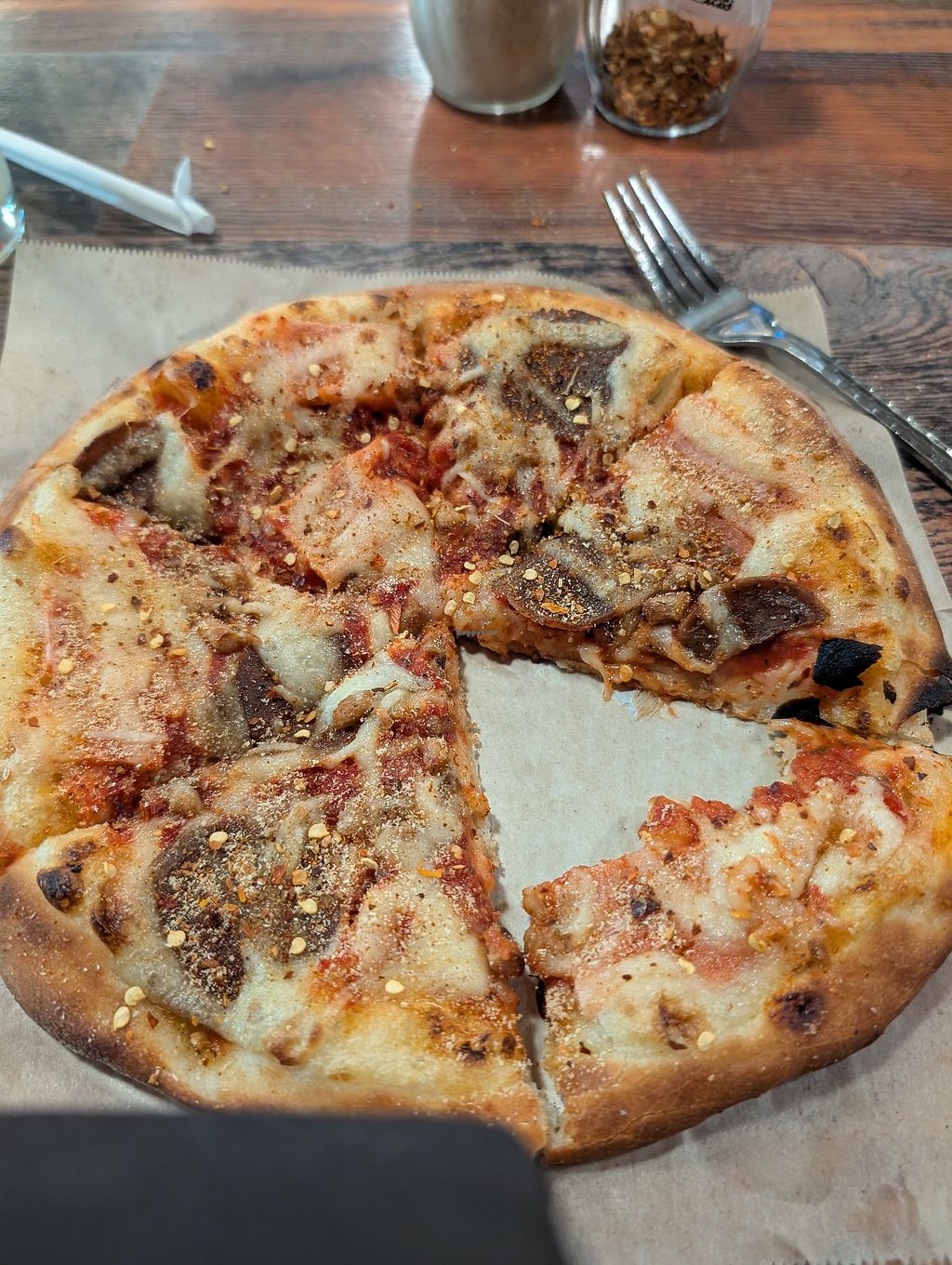 The pizza was loaded with toppings and most importantly, flavor! Crust is light and the vegan cheese they use is great. Everything was delicious and at a nice price for what you get