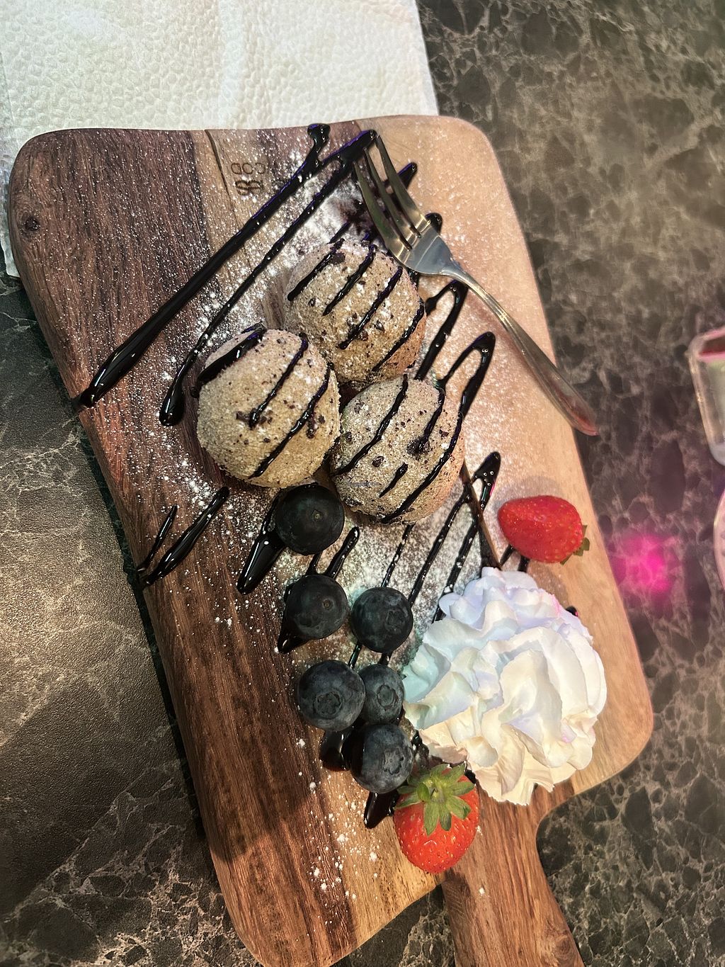 the dessert came like 3 minutes after ordering so i let the balls thaw a little more, and then they became perfect. everything on the plate was a perfect combination.