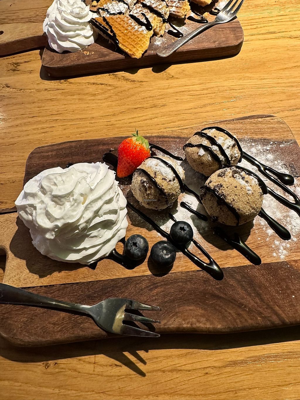 We have been there twice in 2 weeks and both times HAD to get the Bitterballen. It is hands down worth the trip alone, but we did also try the Lemon Shrimp ( super tasty with a spicy dipping sauce ) and the Chicken Satay French Fries ( OMG so good!! ). They also have a good beverage menu, most recent trip we got the cappuccino and was very good, not too sweet and very good coffee. The first time we got smoothies, also very good. I feel like you can always go here for a great and reasonably priced meal and never leave disappointed. They do have desserts but honestly the portions are so big on the meals we never have room for dessert 🍨 🥧