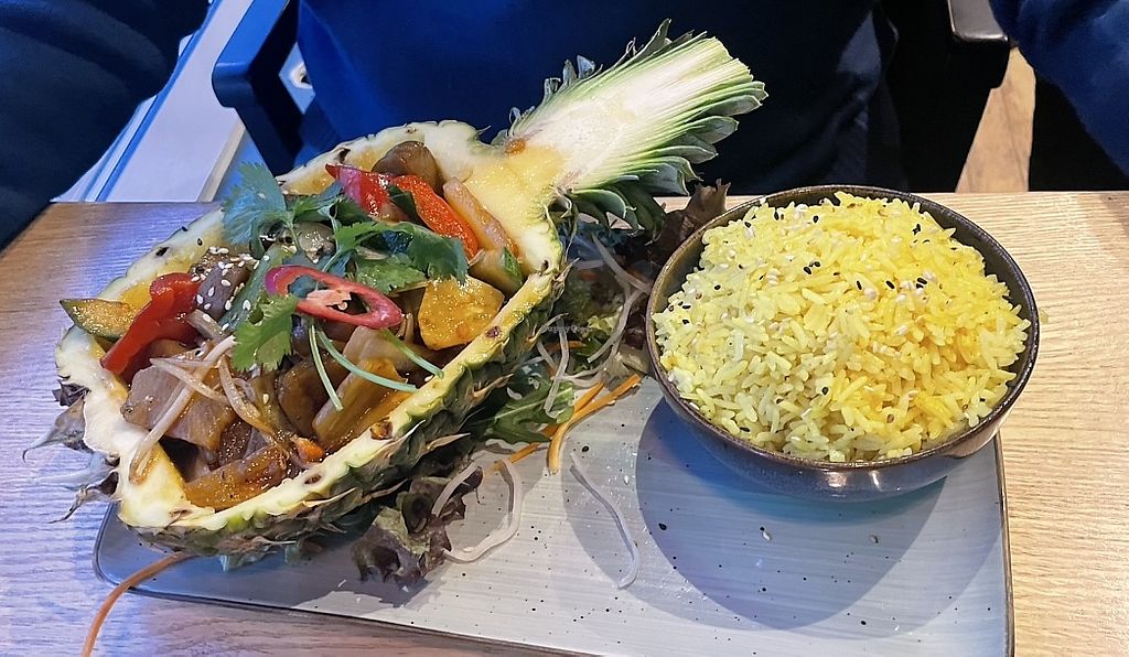 Die Speisekarte bietet eine große Auswahl asiatischer Gerichte, es gibt sogar Sushi. Es ist teuer, dafür ist aber auch alles vegan. Das Essen war schnell da.