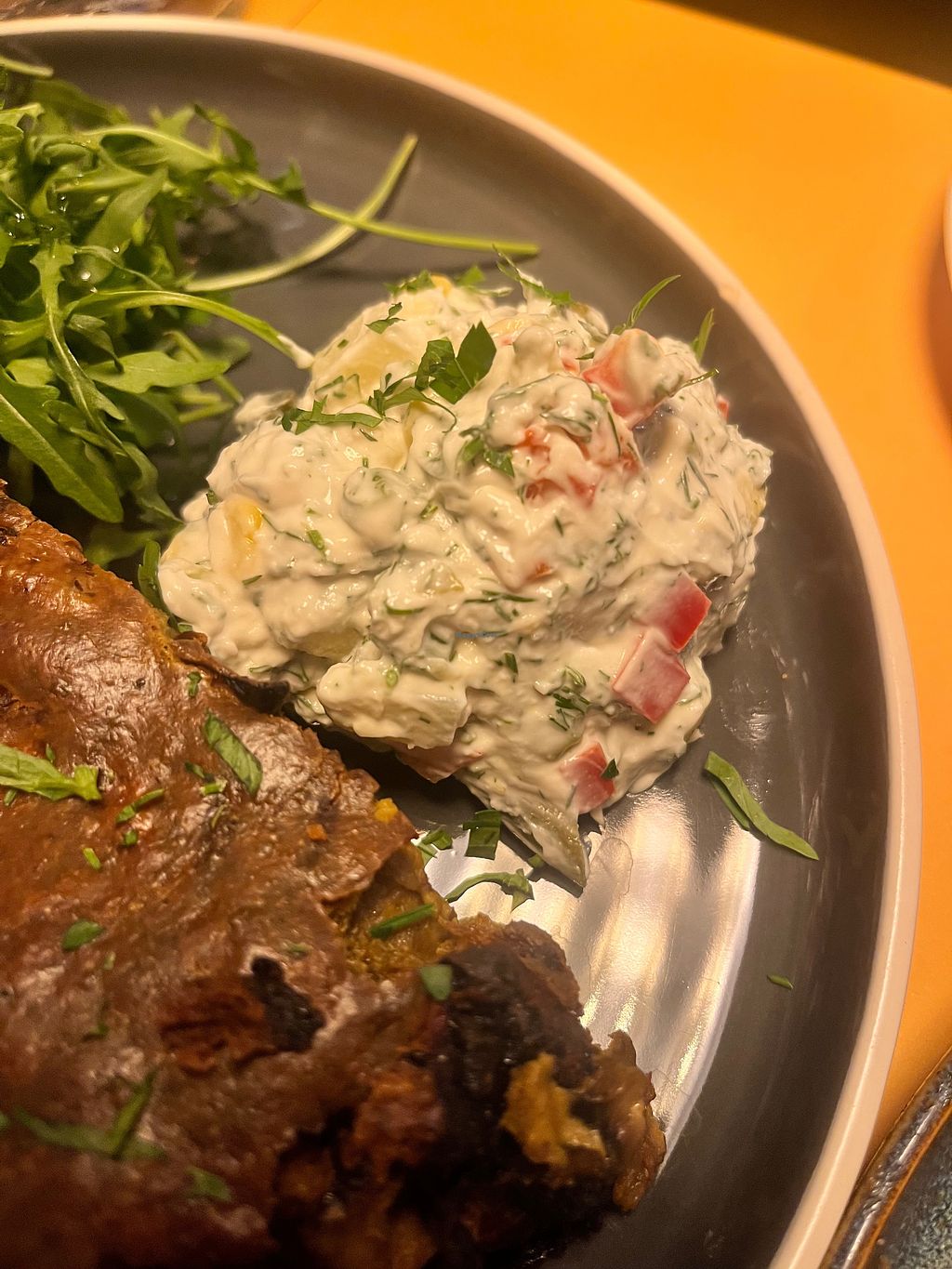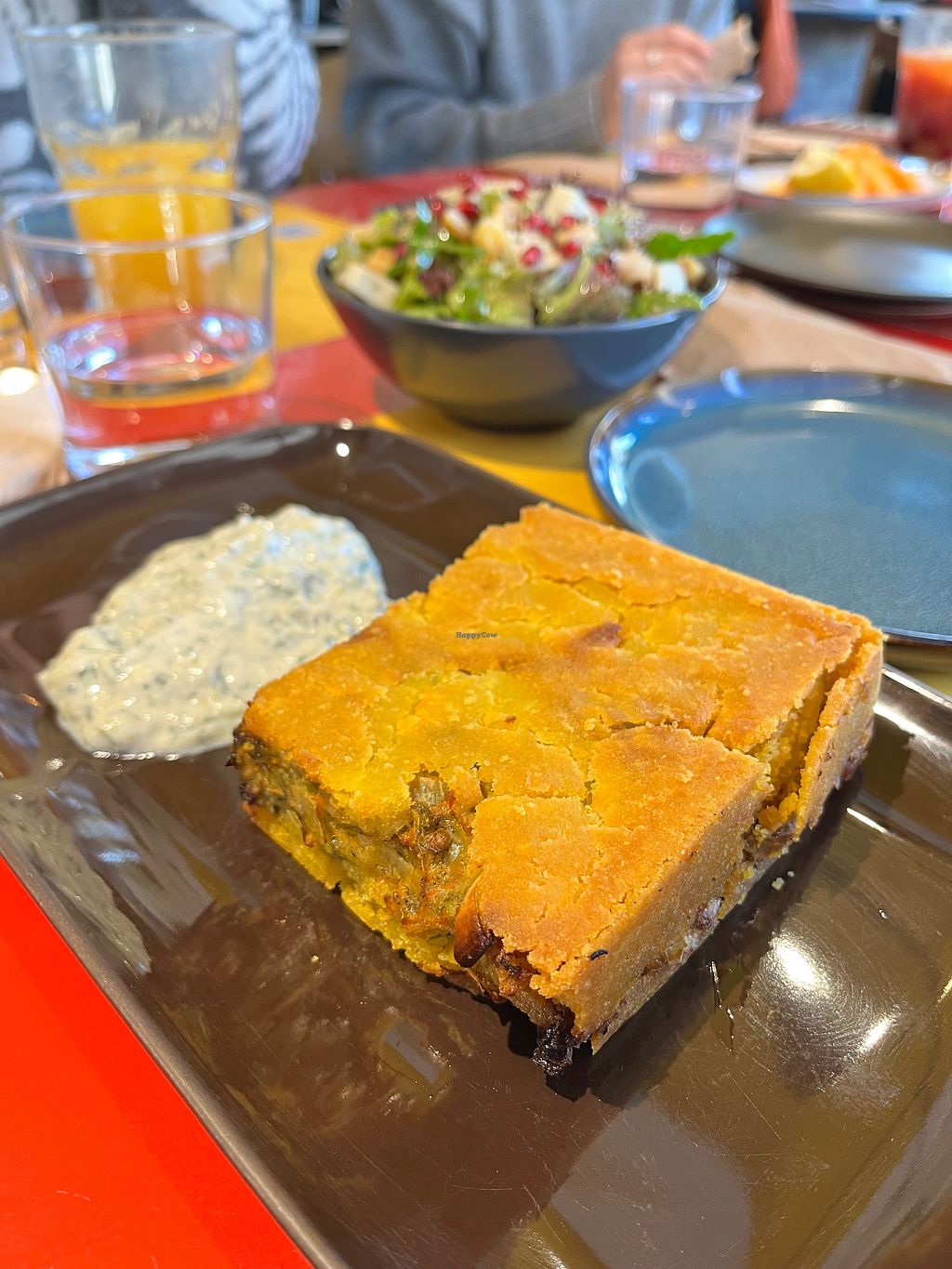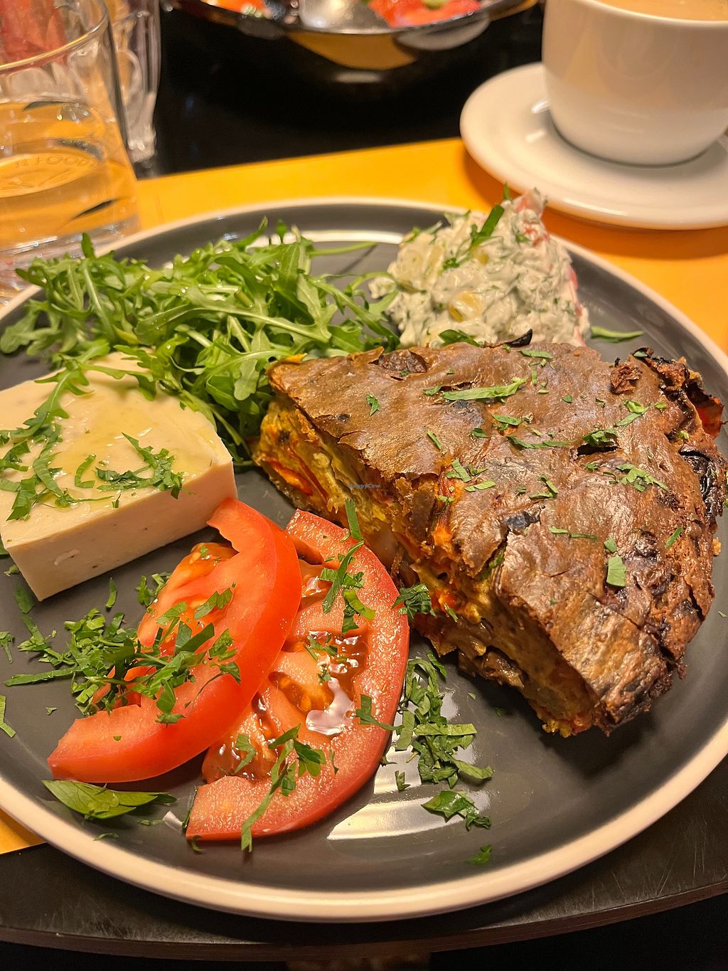 Greek side salad with cashew feta, and Pastitsio