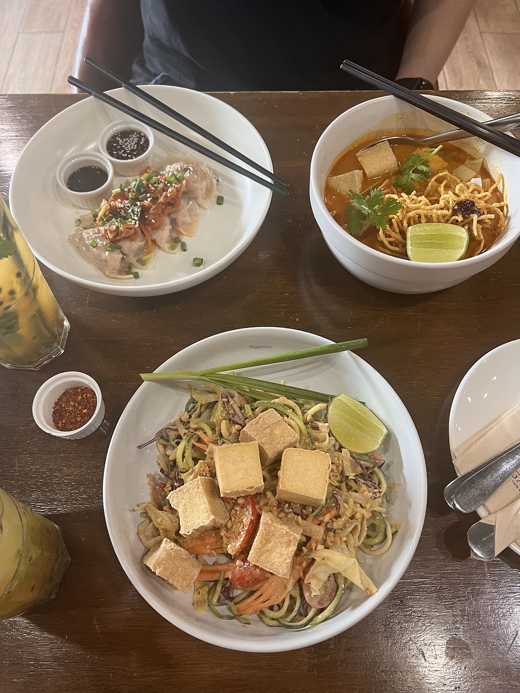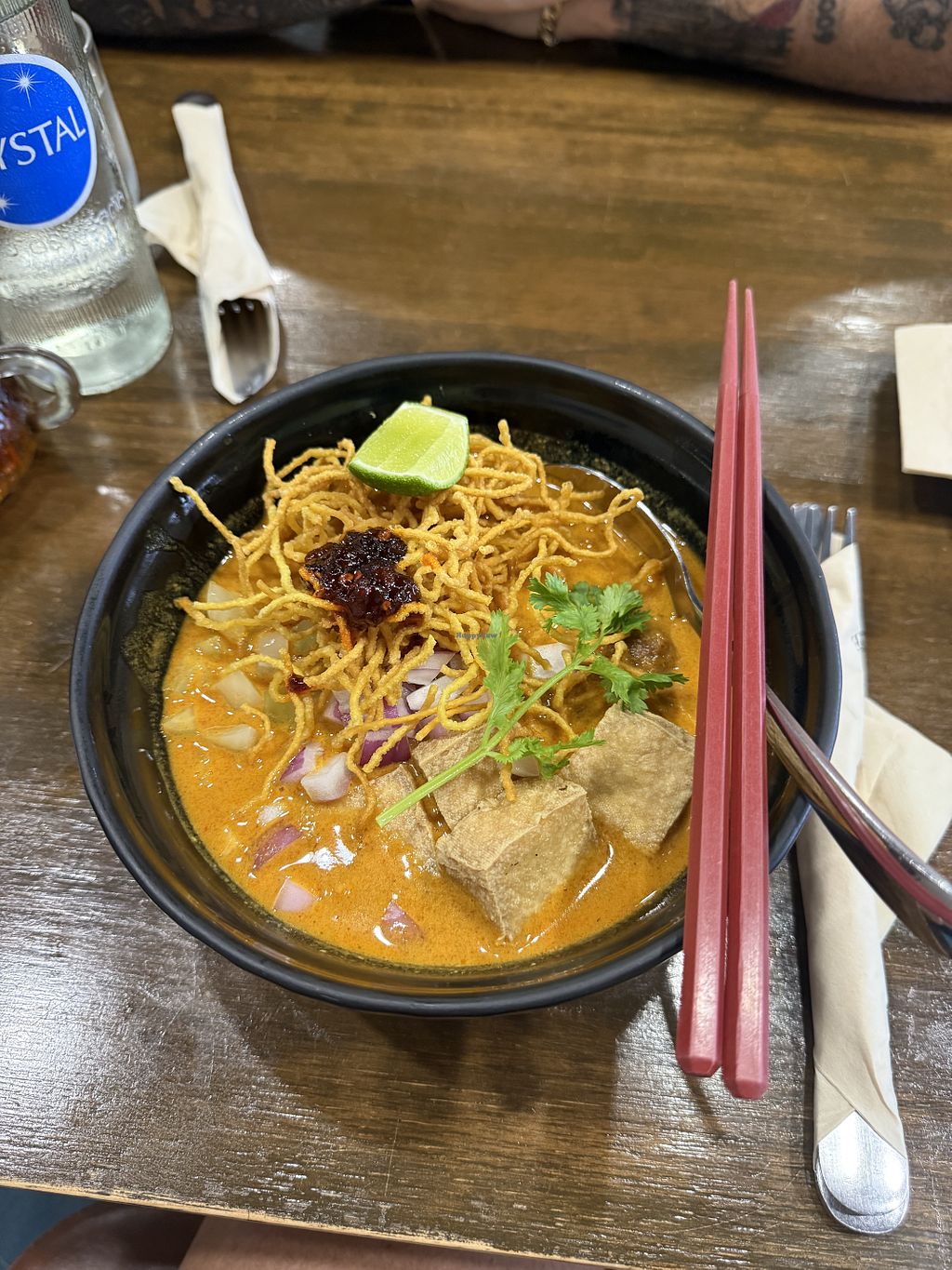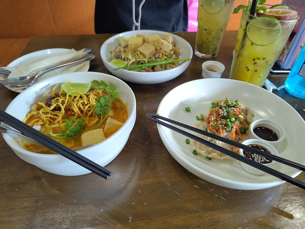 The menu looked epic and catered to many different customers - health conscious, protein hunters, Jay, western, Thai & all day brunchers. But the Tom Yum soup I ordered was disappointing. It seemed like instant noodles with undercooked anemic veggie meatballs. I also ordered a couple of drinks - the mint chocolate chip shake was great! - and a couple of deserts to go - the chocolate mousse cake also disappointing. So it balanced out at a 3-star experience for me. Happy it exists but perhaps the menu is too wide ranging for everything to be a winner and the tom yum was definitely not a winner.
