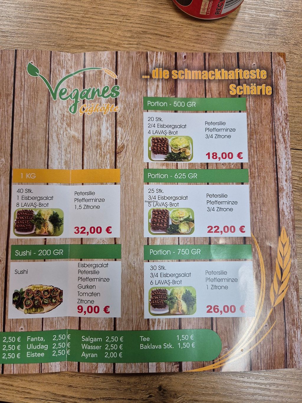 Ein kleines „Restaurant“ mit 4 kleinen stühlchen draußen und etwas Platz innen. Es gibt keine große Auswahl, das das was es gibt ist sehr lecker!! Wir hatten das Sushi und die kleine Portion an Cigköften und das war sehr gut (: es kommt mit frischem Gemüse in einer recht großen Portion! Alles vegan!! (Außer die Getränke zb ayran wird verkauft) dementsprechend kein 100% veganes Lokal aber das Essen kann man ohne bedenken essen ;)