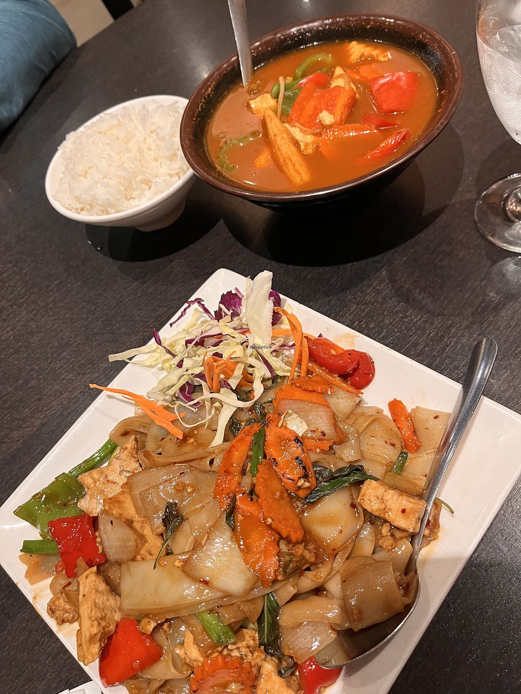 Huge vegan menu with all the Thai favorites! Tons of meat subs, I chose duck which I’ve never had before and it was really good. The pineapple fried rice was slightly different flavor than expected and I was bummed the pineapple wasn’t carmelized. Fried apps (spring rolls, tempura) both good and my friend enjoyed her curry. If I lived in the area I’d definitely want to return and try more dishes.