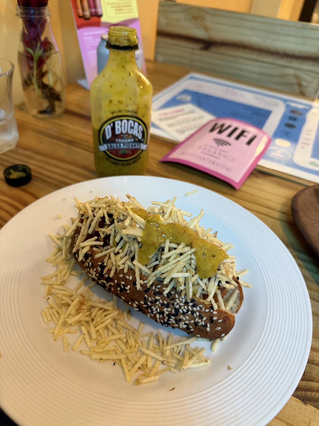 Had the chilli hot dog - it was SO GOOD best vegan hot dog I’ve ever had. Was very bratwurst like sausage and the chilli on top was so delicious. My partner enjoyed the burger a lot too. Plantain chips were nice. The tres leches pudding was also very delicious and rich - basically chocolate mousse!