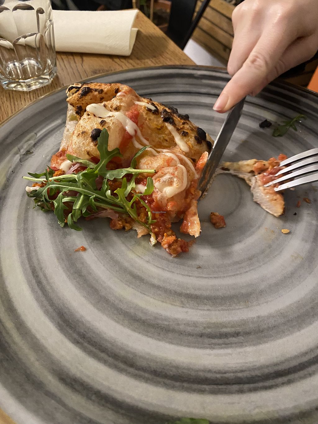 En cuanto a masa y sabor, es la mejor pizza vegana que he comido nunca. La masa es una maravilla pero no le doy 5 estrellas porque me parece pequeña y muy cara la verdad