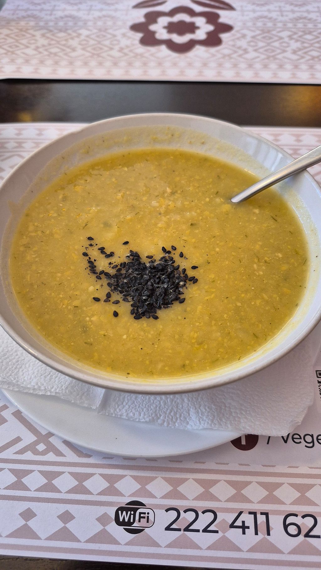 Nice place with hindu, krishna books. Chilling jazz music. We tried the full daily menu with soup, main and salad and all was great and big portion.