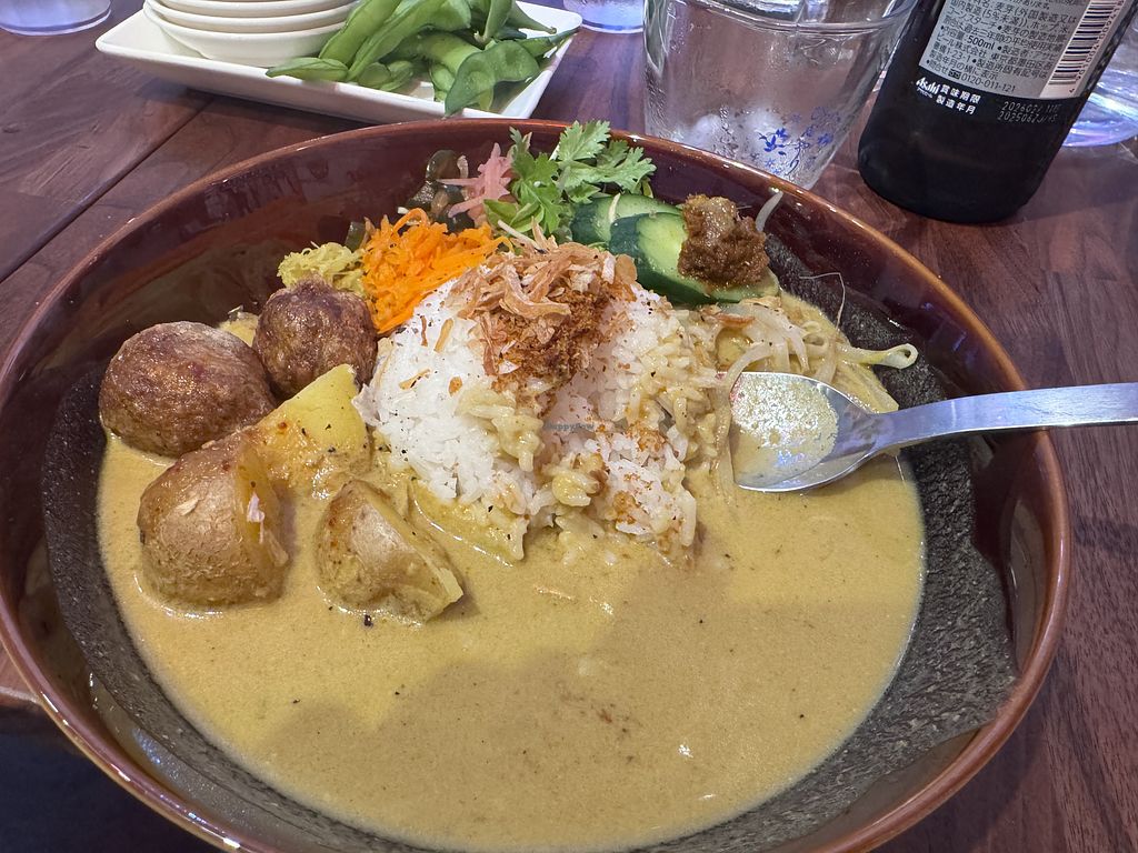 They make everything in house! The vegan meats, all the sauces (mayonnaise made of chickpea etc.). A small seemingly family run business and they have sparkling sake! The Thai curry plate is definitely special, and the wafu chicken is wild.