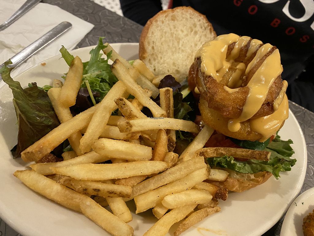 I would easily give 4.5 stars, but this wasn’t quite 5* by big-city standards. The atmosphere was great with a perfect retro diner vibe. The menu was expansive and reasonably priced, with most of it vegan by default. The mozzarella sticks were good, but just standard (Violife?) cheese with some seasoned panko. The clam chowder was a little bland and needed more mushrooms. The Mac ‘n Stack looked as outrageous as it sounded, and again, was good but lacked that extra ‘something’ to take it to the next level. The Boston cream pie was NOT good, with a thin coconut cream rather than custard and tough cake. Boston was surprisingly lacking in vegan options so I’d probably still recommend a trip to check out this classic, but i wouldn’t go back.