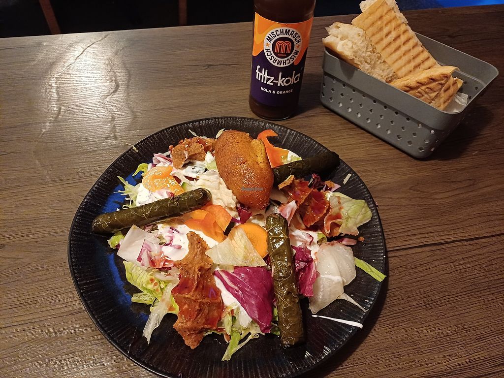 The snack bar offers a vegan plate. This consists of salad, stuffed grape leaves, Çigköfte, Icli Köfte and hummus. The taste of the plate is very tasty and a big recommendation. The staff is very friendly and will happily let you try before you place your first order.