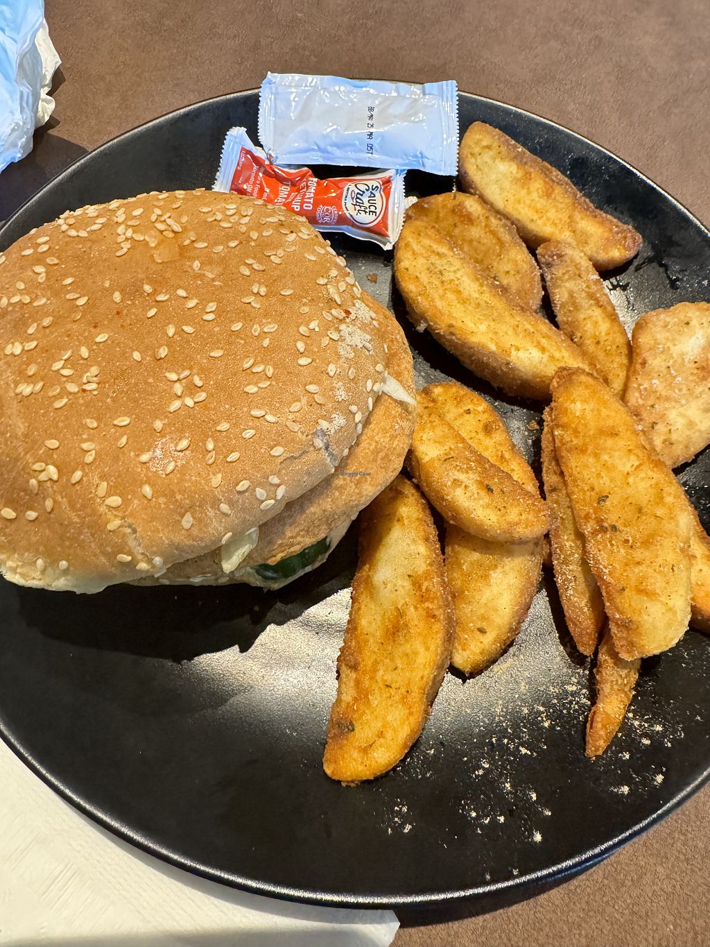 They serve store-bought pies warmed in a microwave (they didn’t even bother to remove it from a foil bowl). The nuggets clearly are store-bought Gardein nuggets that we regularly eat at home, served with a $2 Walmart chilli sauce… We didn’t even finish eating here, and went to A&W instead.