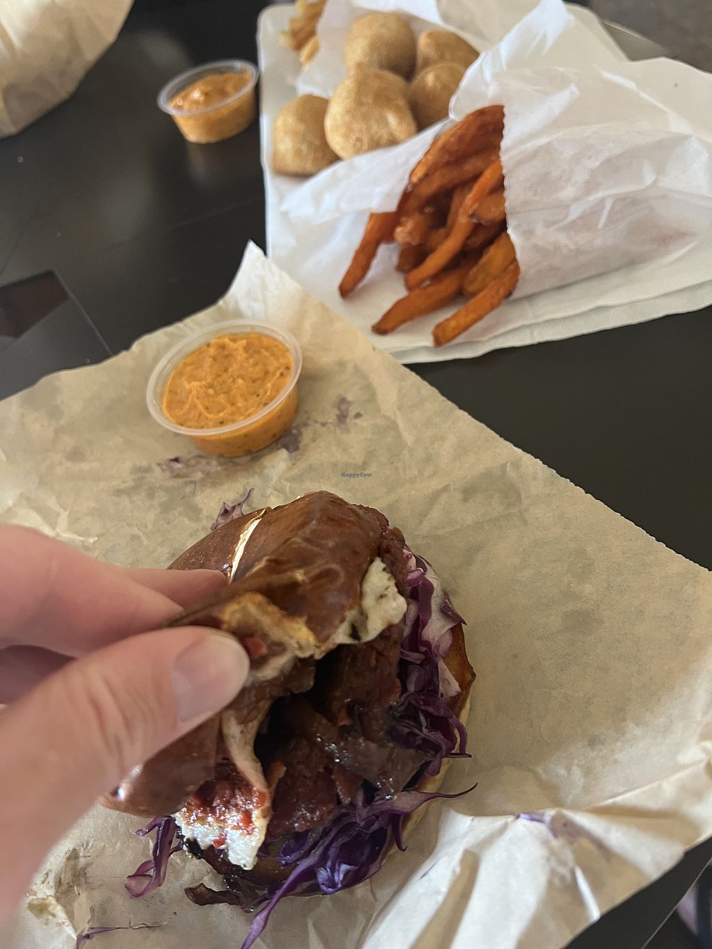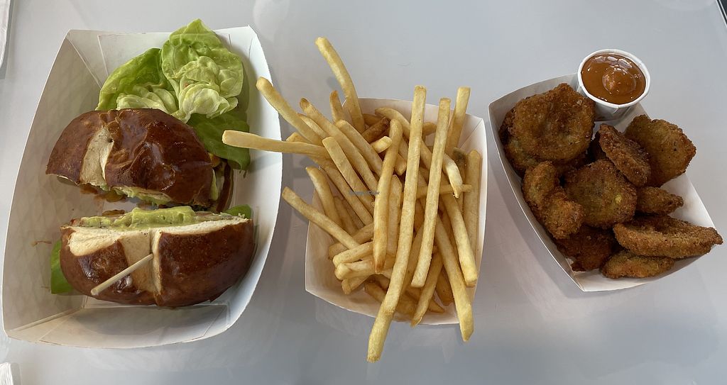 This place was exactly what I wanted, an amazingly delicious vegan burger place. I'm in town for work and needed a place to eat that I didn't need to worry about subbing anything and this place was perfect. I got the Double Trouble Burger on a pretzel bun, the jalapeno poppers and fries. Everything was great. The poppers especially, not a traditional jalapeno popper but more like a cheese nugget full of deliciousness. I have a few more work trips planned to the area I will definitely be back.