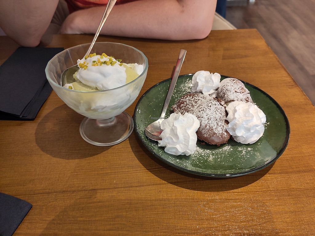 A cool find, as it wasn't listed on Happy Cow when we visited. (It was apparently at a different location and closed at some point.) The appetizer was super delicious. The pasta looked simple but tasted amazing. The desserts were the highlight, especially the profiteroles.