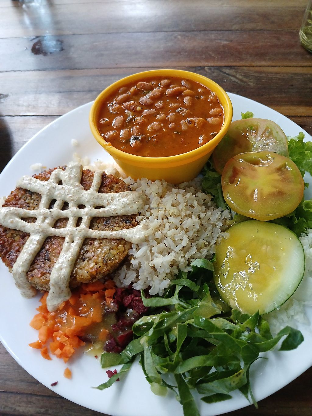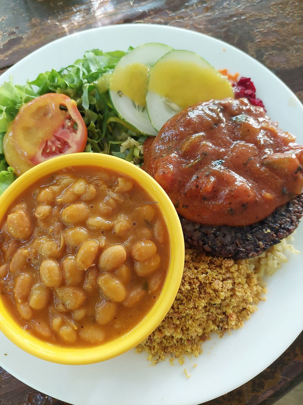 You get what you're served - there's no choice! The first time I went, I had a vegan eggplant parmigiano, better than any non-vegan version I've ever had - with rice and (brilliant) beans and a substantial salad. Second time was soya chunks in teriyaki sauce with what I can only describe as British mushy peas - I've never seen them outside Britain! - again with rice and nice salad. The juices are fantastic. The desserts less so, the cakes were like vegan cakes five years ago - but it's still well worth the trip. Main, dessert and juice was just R$21. Also sells snacks and cakes to go, and a few vegan essentials.
