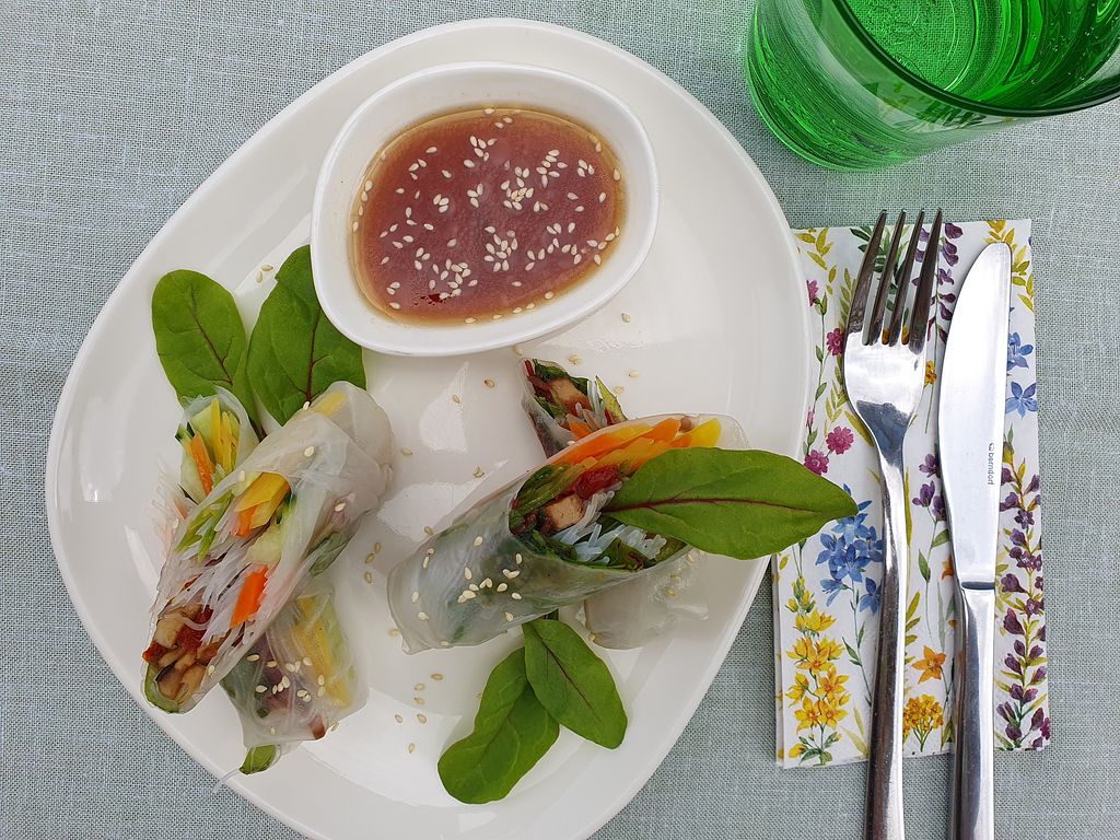 Homemade summerrolls filled with glass noodles, mushrooms, chard, cucu…