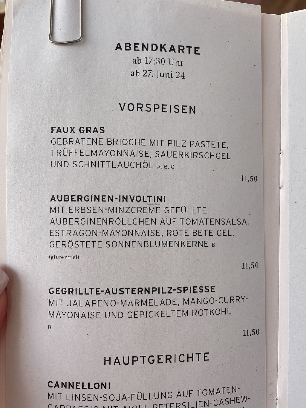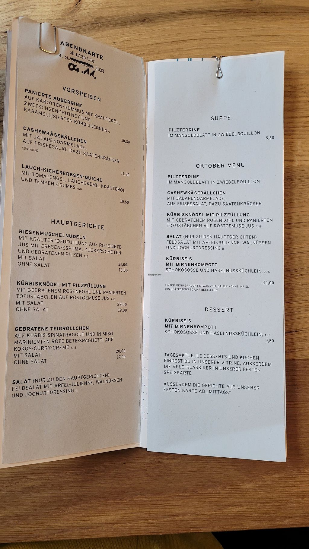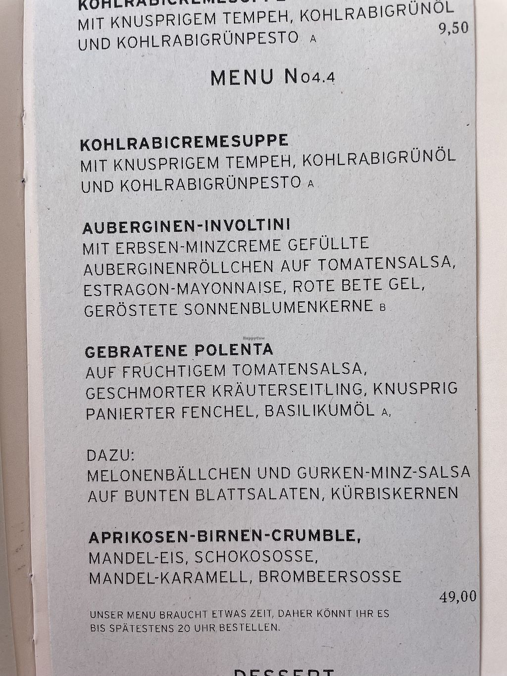 From 5 pm onwards separaten evening Card on top of meals starting from lunch.