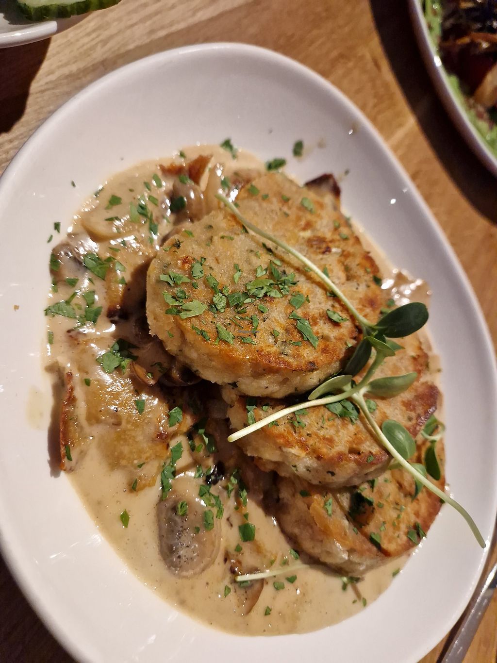 Ich hatte mich für die Serviertenknödel mit Seitangulasch und einen Salat entschieden. Danach ein Schokobrownie mit Eis und Kompott. Es war einfach köstlich!