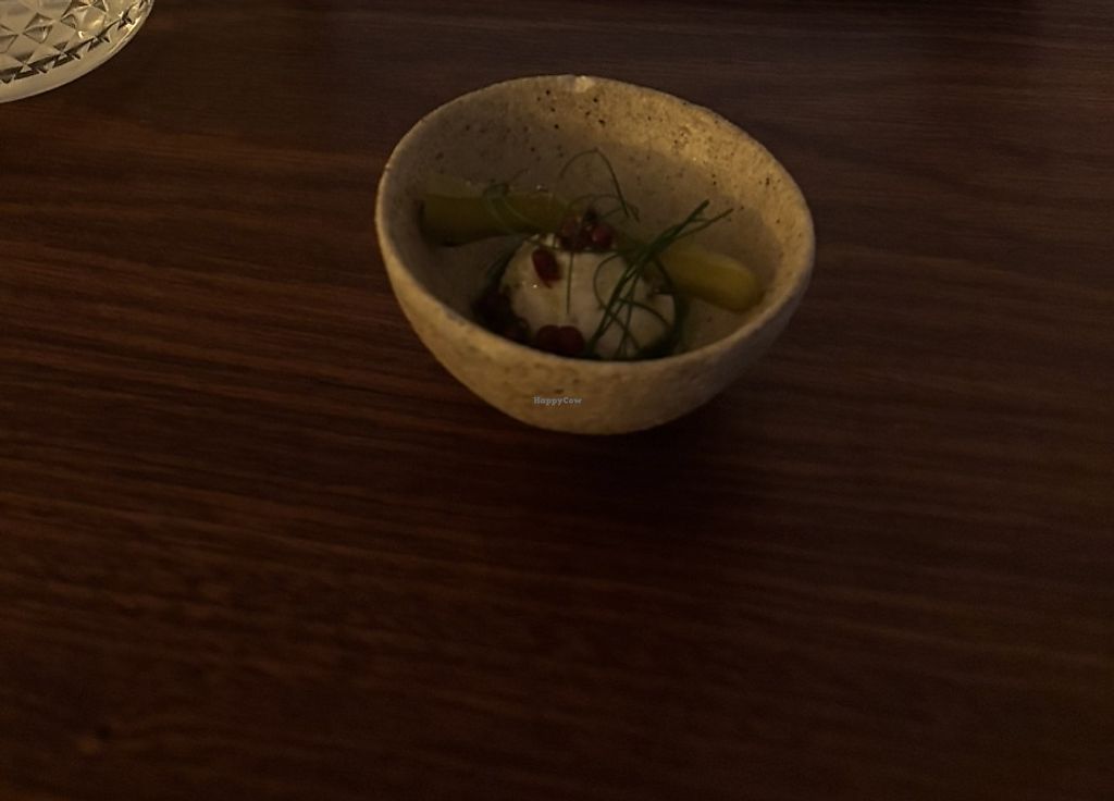 This is close to my idea of the perfect restaurant. I've been in Portugal and Spain for the last 2-3 weeks and this is the best food I had so far, for sure. It rivalled other favourite meals from e.g. London. In particular the crispy rice dish and mushrooms were amazing. I nearly didn't order mushroom as I thought it would be 'just another mushroom dish ' but it was very unique with a sweet glaze and delicious herby salad. Lots of pickles on the plates too, which I love. They make their own lentil tofu which was interesting (tasty enough for me, who will eat raw tofu out the packet) and served with tasty pickled stems and dashi broth. I would have ordered more plates and the bread couvert etc but I was dining alone. Tasting menu seems to have had price increase compared to online- but still good value for the quality of food: currently set menu 30€ 3 plates or 38€ 4 plates with discounted dessert 5€. Wines looked good too and there is a pairing option and even a non alcoholic aperitif pairing option! Love it