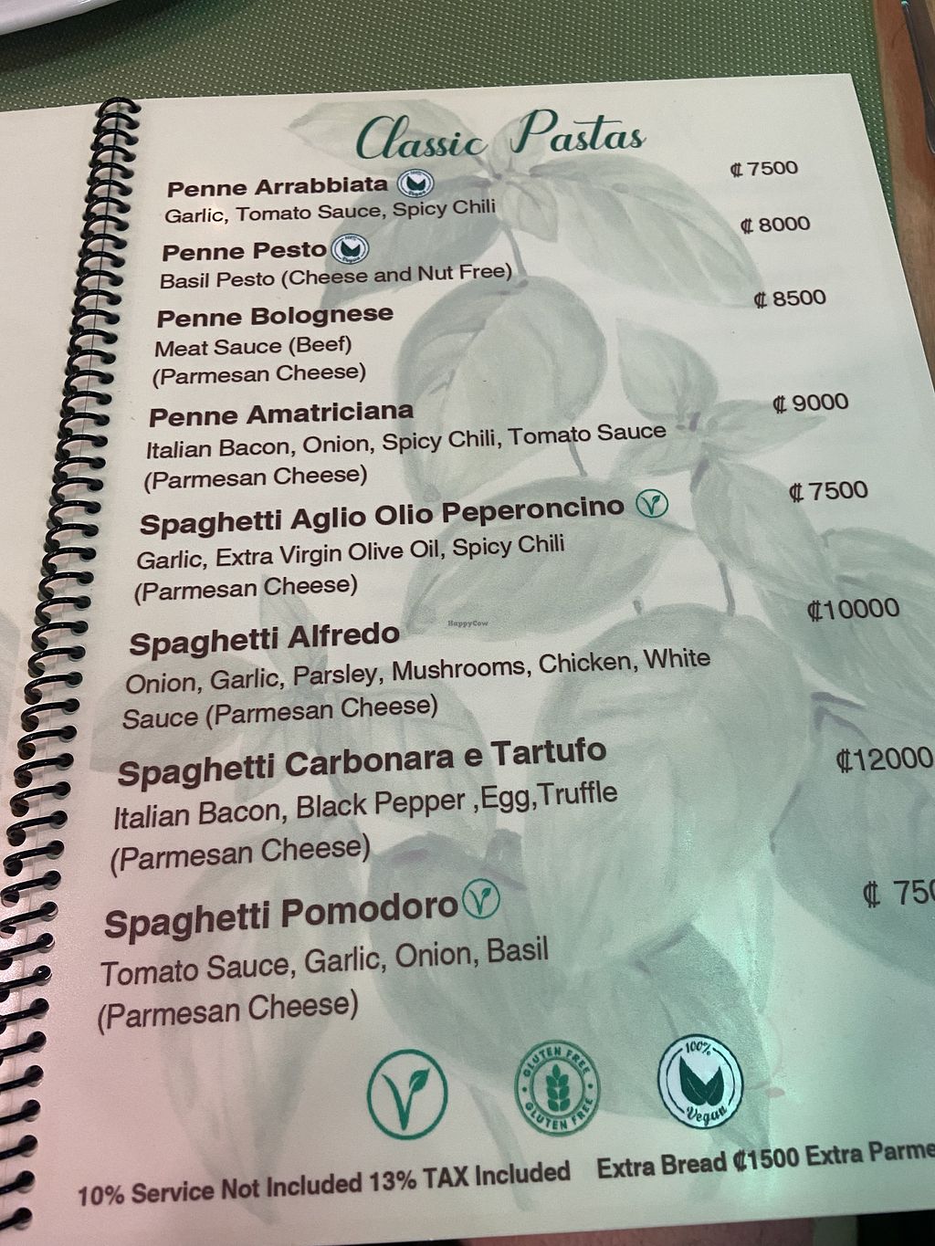 Serves meat, vegan options available. Restaurant offering vegan dishes clearly labeled on the menu, such as vegan bruschetta, hemp salad, spaghetti pomodoro, and spaghetti aglio e olio. Vegan cheese is offered for pizzas, and lemon sorbet is featured for dessert. Open Mon-Tue 11:00am-9:00pm, Wed 9:00am-9:00pm, Thu-Sun 11:00am-9:00pm.