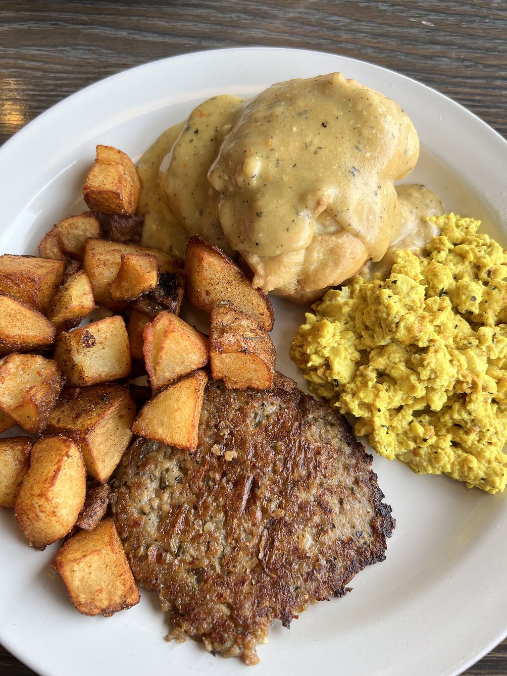 Potatoes, biscuits and gravy, tofu scramble, sauzage