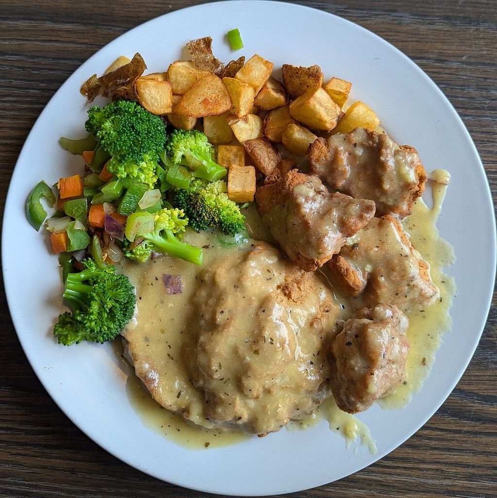 Chicken Fried Steak with broccoli and GARLIC mashed potatoes