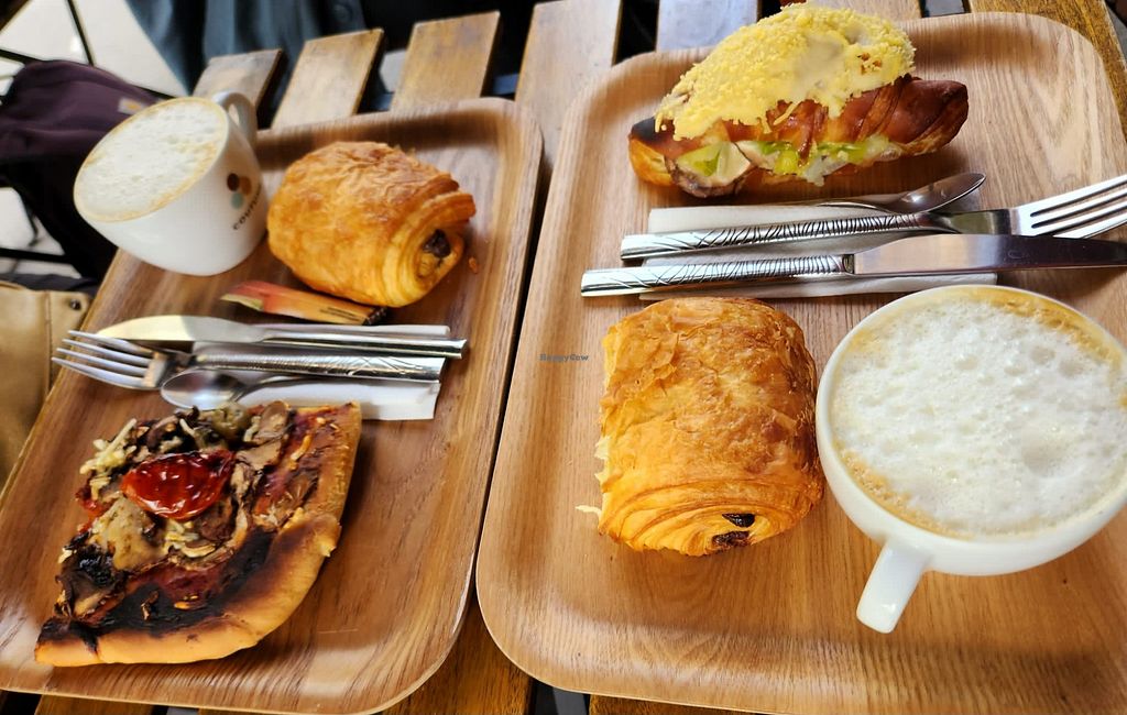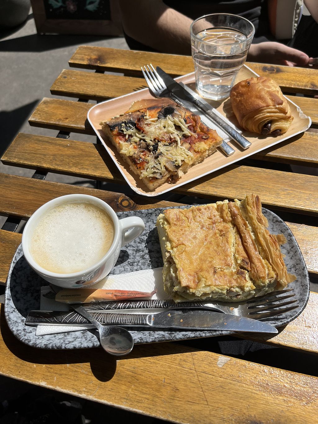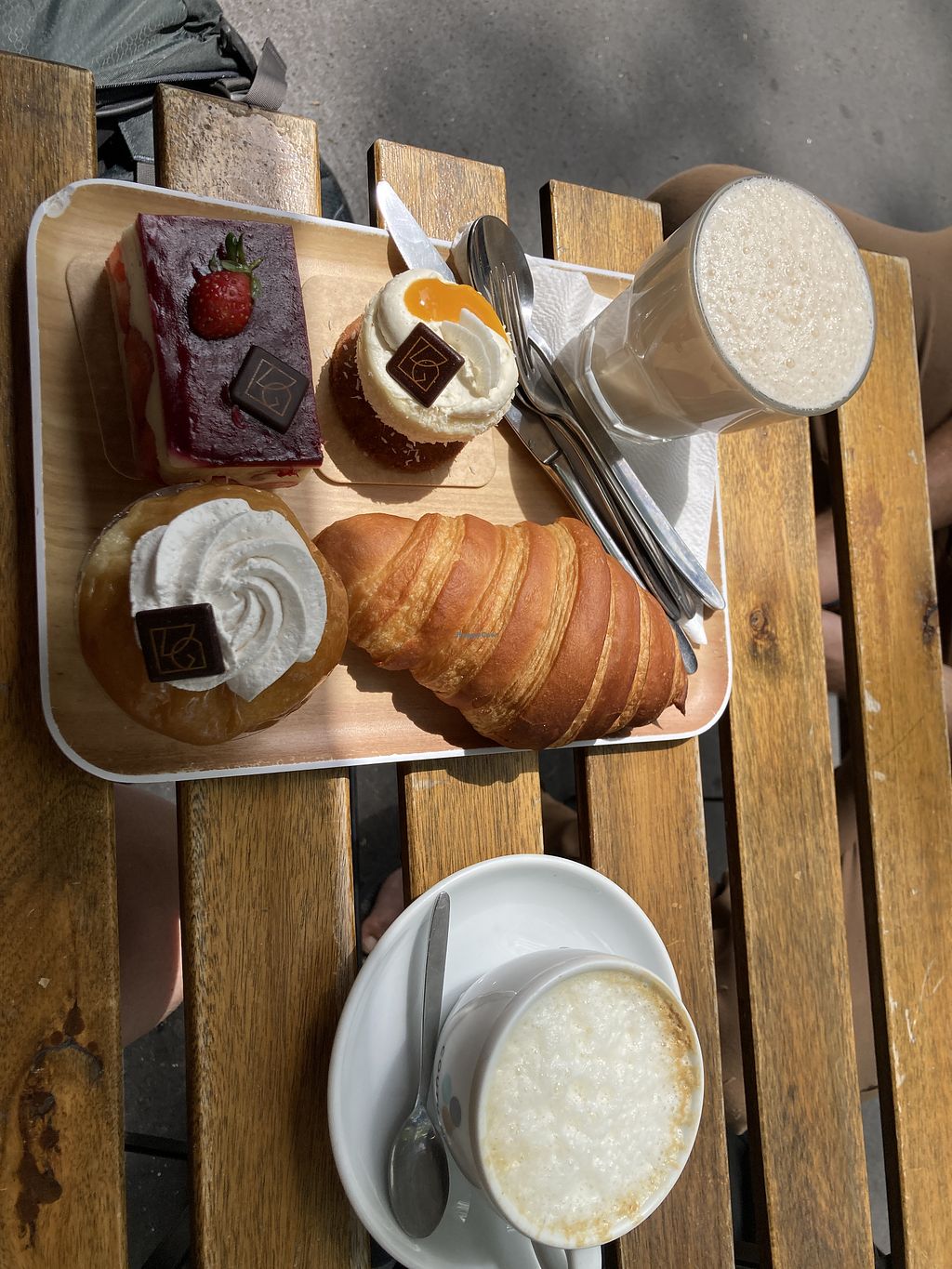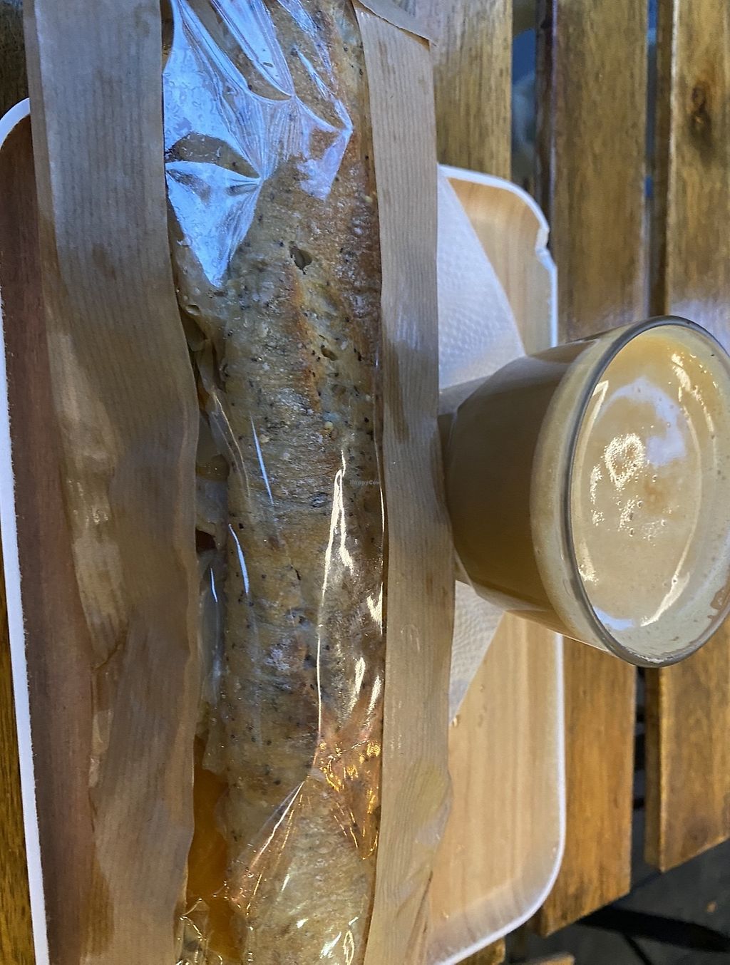 vegan chicken sandwich with eggplant and an oat milk iced matcha!