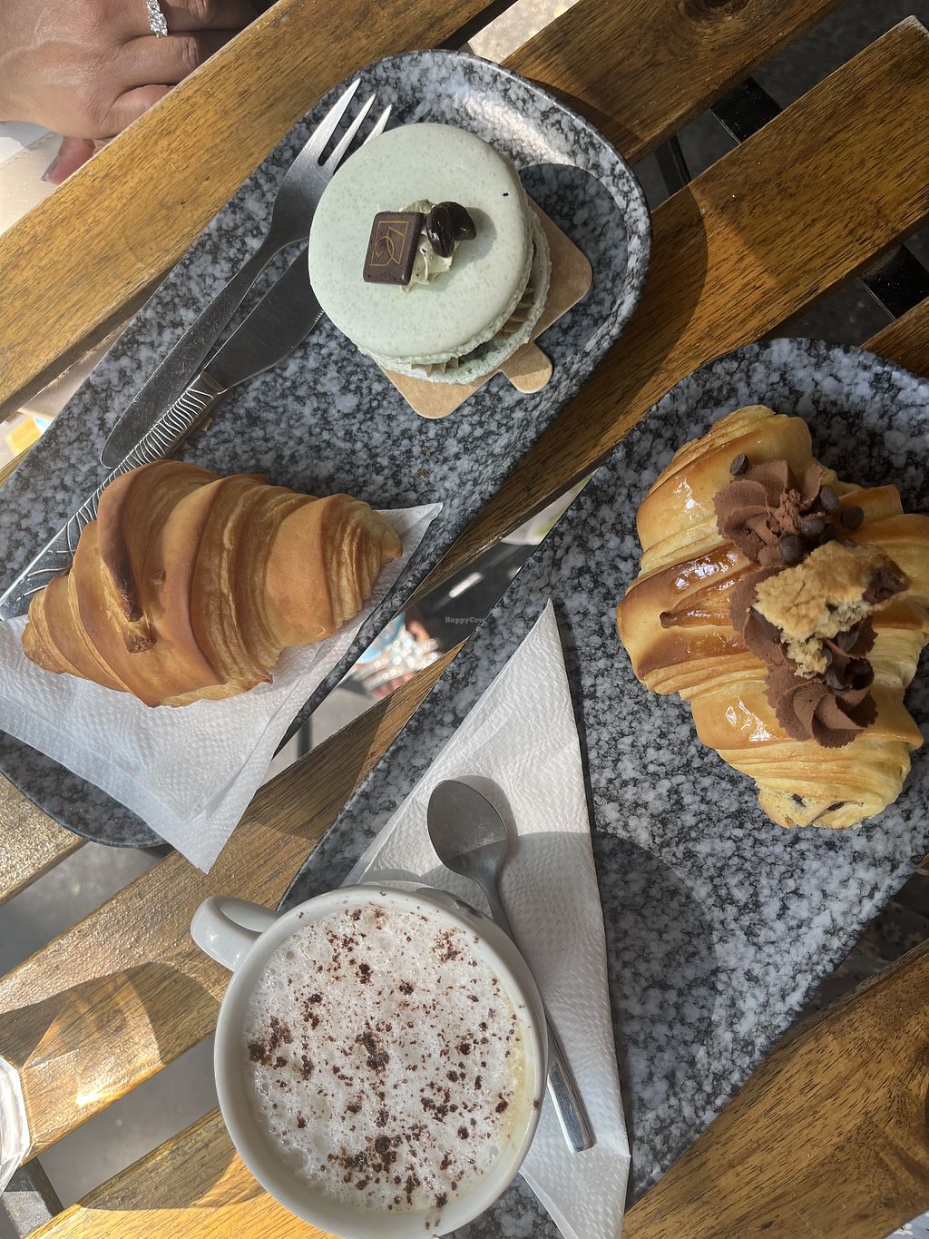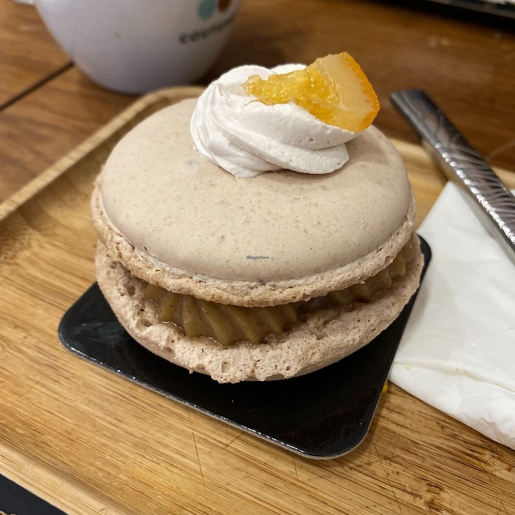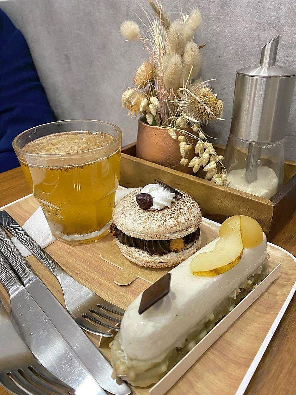 Jus de pomme chaud, macaron pralin-choco, entremet poire-yuzu