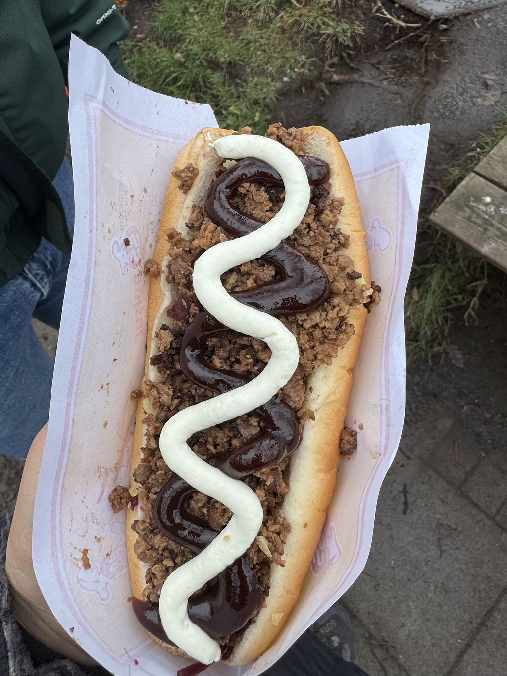 The hot dog was perfect in amount and flavour but sadly due to the weather and surface got cold really quickly. It had crisps on the base and a vegan mince on the top and was a perfect combination of flavours and textures
