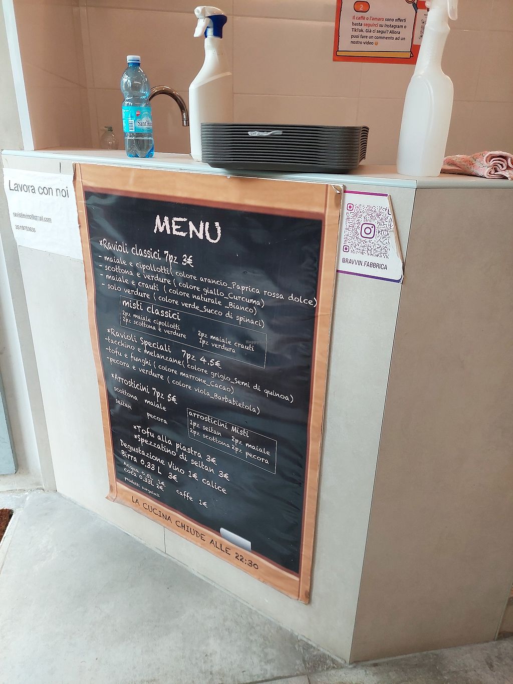 One portion consists of 7 ravioli. They have "only veggies" for 3 eur per portion or "tofu and mushrooms" for 4.5 eur. A can of coca cola is 2 eur, a glass of wine is 1 eur.