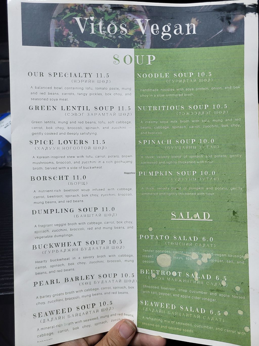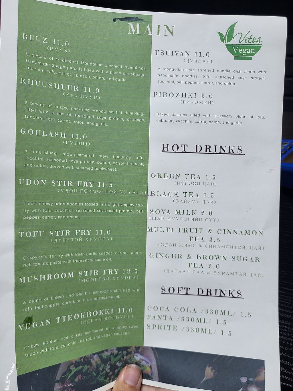 One another vegan restaurant in Ulan-Bator which is worth it to taste. Soup as their vegan Khushuur are fantastic. Time didn't let me eat a second time there.