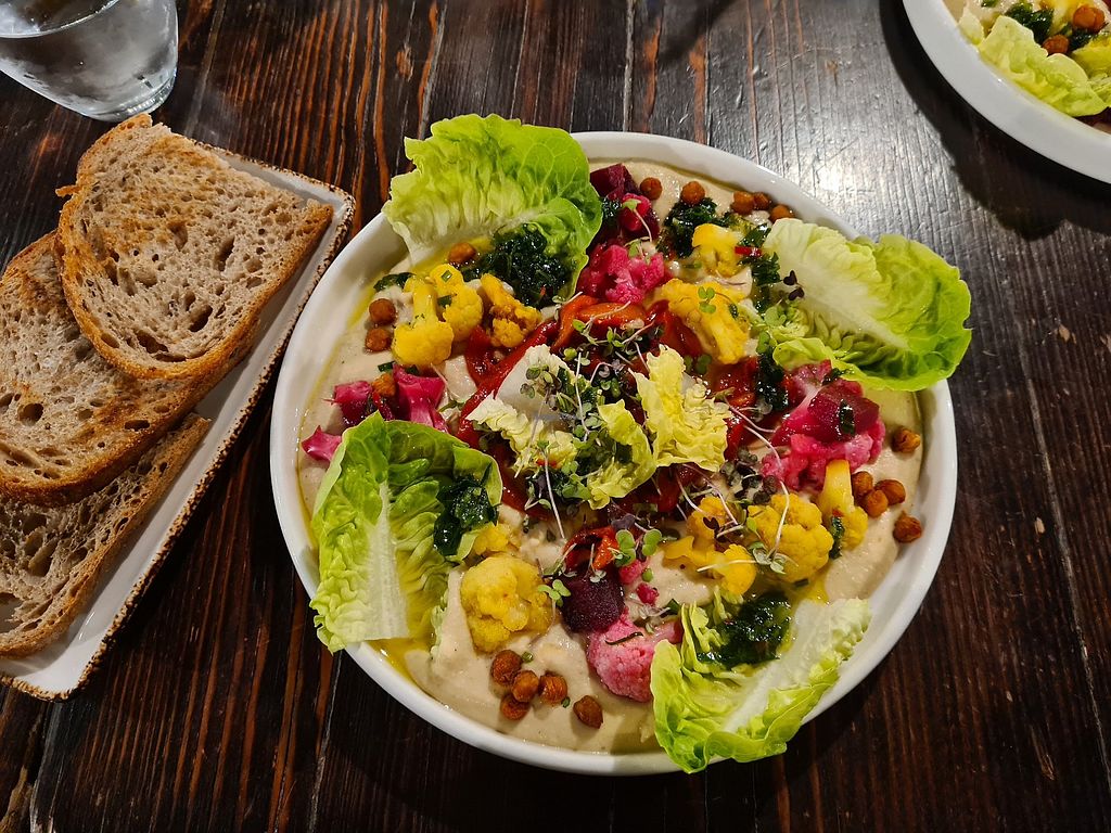 Not many vegan options but they served a pretty decent hummus with lots of colourful pickeled cauliflower and toasted sourdough bread. Simple but great dish. Staff was also really friendly.