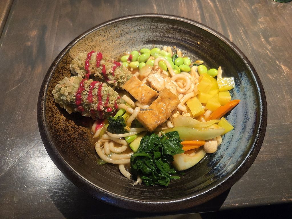 Serves meat, vegan options available. Asian fusion restaurant with labeled vegan options incl. vegan wines. Choices include curries, sushi, udon noodles, and spring rolls. Open Mon-Thu 11:30-22:30, Fri-Sat 11:30-23:00, Sun 13:00-22:30.