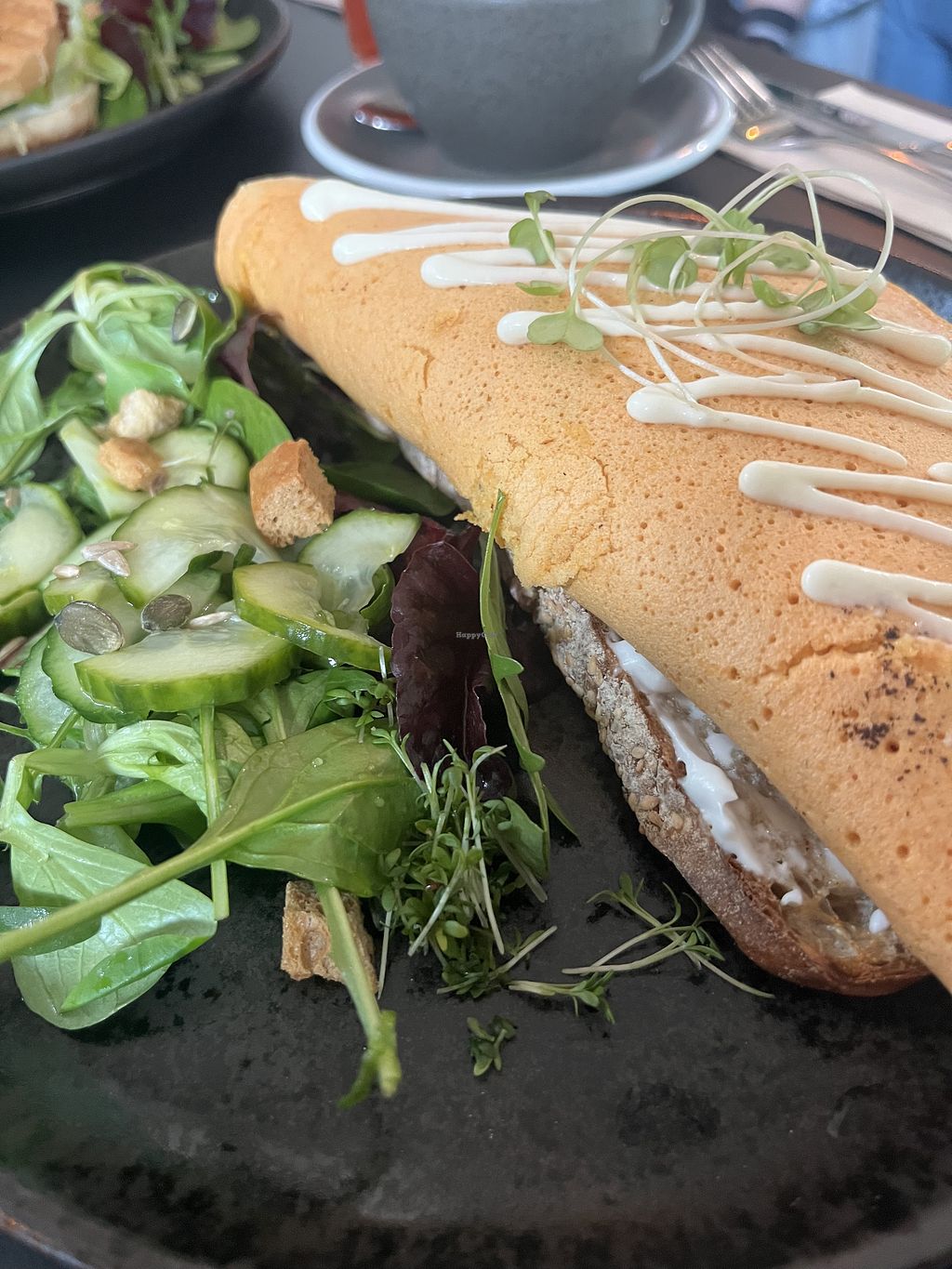 super delicious lentil omelette! also loved the rhubarb cake! and the mozarella made from cashews on the toast was so good!